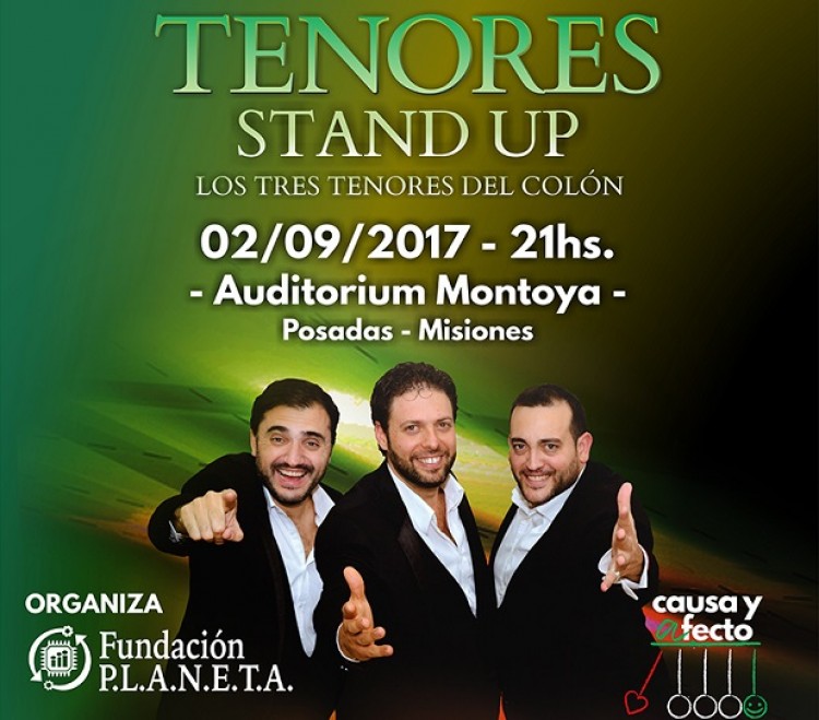 El espectáculo solidario, denominado "Causa y afecto", subirá a escena a partir de las 21:00 del 2 de septiembre. Las entradas están a la venta en el hall del Instituto Montoya. El show, organizado por la Fundación Planeta (Programa Latinoamericano de Nuevas Estrategias en Tecnologías Avanzadas), tiene como objetivo contribuir al desarrollo del programa "Nutrición Verde", cuyo fin es combatir la malnutrición infantil mediante la producción y el consumo del alga espirulina. Actualmente, el proyecto se desarrolla en el barrio La Nueva Esperanza de Posadas, en el jardín "Esperanza de Luz", y cuenta con el beneplácito de la Cámara de Representantes de la Provincia.Esteban Hildenbrand, Nazareth Aufe y Diego Bento, cantes liricos del prestigioso Teatro Colón, conforman "Tenores en vivo" y brindan un show que combina música y stand up, que emociona y hace reír. El espectáculo se desarrolla mediante un hilo conductor basado en el humor y el dinamismo representados por la interacción con el público, el cual es invitado a participar cantando los fragmentos corales de los temas más conocidos del repertorio de los tenores Pavarotti y Plácido Domingo. Desde “O sole mío” hasta “A mi manera”. Desde “La donna e móbile” hasta el tango “El día que me quieras”. Para mayor información, los interesados pueden contactarse al teléfono 3764 800819 o al correo [email protected]