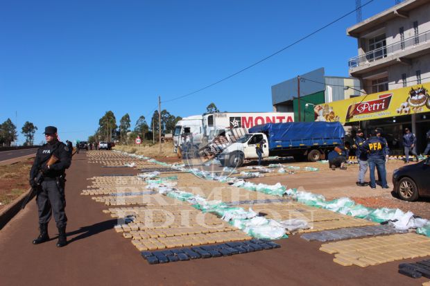 En el lugar menos pensado, sobre la ruta nacional 105 y en el acceso al populoso barrio Santa Helena de Garupá, las autoridades incautaron más de cuatro toneladas de marihuana y desarticularon así una narcobanda que operaba en esa localidad, con vínculos en la ciudad entrerriana de Concepción del Uruguay y Buenos Aires.Ocho de los miembros de la organización fueron detenidos en el marco de la investigación, llevada adelante por parte de efectivos de la Policía Federal Argentina llegados especialmente a Misiones desde Buenos Aires, quienes contaron con colaboración de sus pares de la Delegación Posadas. La labor de los uniformados comenzó en la tarde del último viernes y finalizó el sábado casi entrada la noche. Ese trabajo permitió, además, secuestrar un camión Renault de gran porte perteneciente a una empresa de transportes de San Fernando (Buenos Aires), un vehículo similar pero de menor tamaño marca Ford, dos automóviles de matrícula paraguaya y hasta un autoelevador o montacargas -popularmente conocido como “Sampi”- utilizado para acomodar “pallets”.Debido a la magnitud del cargamento, así como la envergadura de una organización con una logística suficiente para transportar esa carga desde Paraguay, vía Garupá, hacia las provincias centrales, se anunció la presencia en Posadas de Patricia Bullrich, titular del Ministerio de Seguridad de la Nación. Sin embargo, a última hora del sábado, sin brindar mayores explicaciones, se informó que aquella conferencia, prevista en la Delegación Posadas de PFA había sido postergada hasta este lunes al mediodía.Sorpresa en el barrioSegún pudo saber PRIMERA?EDICIÓN, la investigación se inició desde hace por lo menos tres meses por orden del magistrado Pablo Seró, titular del Juzgado Federal de Concepción del Uruguay, y contó -entre otras cosas- con escuchas telefónicas y vigilancia encubierta.Con los datos obtenidos mediante esa pesquisa, minutos después de las 17 del último viernes los efectivos federales irrumpieron en el galpón emplazado sobre la colectora oeste de la ruta nacional 105 y avenida Santa Helena, acceso principal al barrio homónimo.El predio, que posee dos entradas para camiones, está ubicado al lado de una panadería, a unos 200 metros de la rotonda entre las rutas nacionales 12 (By Pass) y 105.Allí se procedió a la detención de los involucrados y al hallazgo del estupefaciente, que era pesado hasta anoche, al cierre de esta edición. La droga estaba dividida en “ladrillos” que, a su vez, conformaban paquetes o “panes” de mayor tamaño, cada uno conformado por aproximadamente quince de esos “ladrillos”.Si bien no trascendieron mayores detalles al respecto, se supo que la marihuana incautada estaba a punto de ser cargada en un camión Renault perteneciente a una empresa de transportes oriunda de San Fernando, en Buenos Aires. El hallazgo de tres enormes “pallets” con bolsas de carbón hace presumir que la droga iba a ser escondida detrás de ese mineral para eludir los controles y llegar a destino.El sábado por la mañana, el cargamento completo quedó exhibido sobre la colectora mientras los federales realizaban el recuento y posterior pesaje. Vecinos de distintos barrios de Garupá se acercaron entonces a contemplar la situación, que literalmente paralizó el trajinar diario en la zona.Más allá del hermetismo en la investigación, trascendió que los ocho detenidos serían misioneros. La pesquisa apuntaba también a esclarecer la ruta utilizada por los narcotraficantes para transportar el estupefaciente hacia Buenos Aires.Fotos: Gentileza N.Maradona