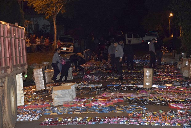 Apenas 24 horas después de incautar un F 350 repleto de juguetes en Gobernador Roca, investigadores de la UR-IX no descartaron la información acerca de la existencia de otro camión de mayor porte que iba a ser cargado en  la zona, con el mismo producto: juguetes de fabricación china.Tras montarse vigilancia en municipios aledaños, finalmente la novedad llegó anoche desde la comisaría de Corpus y en este municipio-sobre calle Luis Romero Pérez- los policías interceptaron un camión Ford Cargo conducido por un hombre de 44 años quien a su vez era acompañado por otro de 60, uno de 27 y un menor de 16, todos oriundos de Posadas.Ya con intervención del Juzgado Federal se requisó la carga y se encontró un total de nueve mil juguetes consistentes en muñecos articulados, autitos, pistolas de juguete, handys, pistolas de silicona, Blay Blade, Peppa Pig, trompos, maquillaje infantil, helicópteros y pistolas de balines, etc. todos de plástico y de fabricación China.El conteo se efectuó al dispersarse la mercadería a lo largo de una cuadra, sobre calle Pérez. El juzgado Federal de Oberá dispuso el secuestro del cargamento, camión y documentaciones. Entre la carga del miércoles en Roca y el de anoche en Corpus, el aforo asciende a 3,5 millones de pesos en el marco de un intenso operativo anticontrabando supervisado por el Ministerio de Gobierno de Misiones.