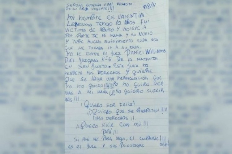 La nena de 10 años vive con su papá pero un juez dictaminó que la pequeña se reencuentre con su mamá.Sus familiares acusan al juez Jorge Daniel Williams, a cargo del Juzgado de Familia N° 6 de La Matanza, de hacer caso omiso al derecho de la menor de no querer volver a ver a su madre, con quien la Justicia intenta una revinculación, pese a que en el expediente consta que la menor fue maltratada y abusada sexualmente."Se trata de una causa penal en trámite en la que está denunciada la madre y su pareja", explicó la abogada del padre de Valentina, Angélica Francioso.El juez Williams fue denunciado por sus anteriores equipos interdisciplinarios para un jury. "Yo no quiero ver más a mi mamá. No quiero sufrir más.", escribió la nena en una carta de puño y letra a la gobernadora de la Provincia de Buenos Aires, María Eugenia Vidal, y que en las últimas horas se viralizó en Facebook a través del grupo "Niños en riesgo".Lejos de un debido proceso judicial, "la causa está llena de irregularidades que vulneran los derechos de la niña, sometiéndola y revictimizándola una y otra vez", afirmó Francioso.La abogada denunció que: "A pesar de los informes de los profesionales y del conocimiento de la exposición de Valentina víctima de abuso, el juez no ha tomado ninguna medida de resguardo hacia la menor. Todo lo contrario", denunció.En tanto Miguel, el padre de Valentina subrayó que "su hija terminó esta semana dos veces en una guardia hospitalaria por el estrés que le genera toda esta situación, escribió la carta a Vidal. Siente que es su último recurso", dijo preocupado por la integridad psicológica de la nena.En la causa que ahora está en la Cámara de Apelaciones, la menor declaró que durante las visitas su madre la golpeaba, le dio alcohol, la hacía dormir en el medio de la cama entre ella y su pareja, que la manoseó y llegó a bajarle el pantalón.Todo esto hace que Valentina le tenga pánico a su mamá y no quiere volver a verla, informa Noticias Argentinas.