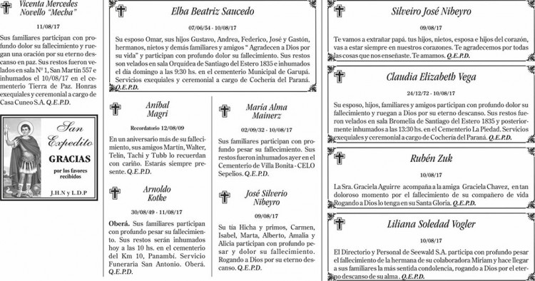 Fúnebres del sábado 12 de agosto de 2017