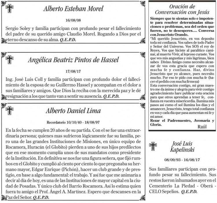Fúnebres del jueves 17 de agosto de 2017