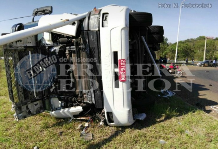 Según los primeros datos, el conductor del camión realizó una brusca maniobra para no chocar a un motociclista, momento en el cual golpea un Chevrolet Corsa que circulaba en su misma dirección. Finalmente y ya sin ningún tipo de control el camión termina volcado a un costado de la arteria.El rodado mayor provenía de Santa Catarina, Brasil y transportaba pescado. En el Corsa se trasladaba una mujer con niños.Intervino personal de la Policía de Tránsito, Comando, y Policía Científica.