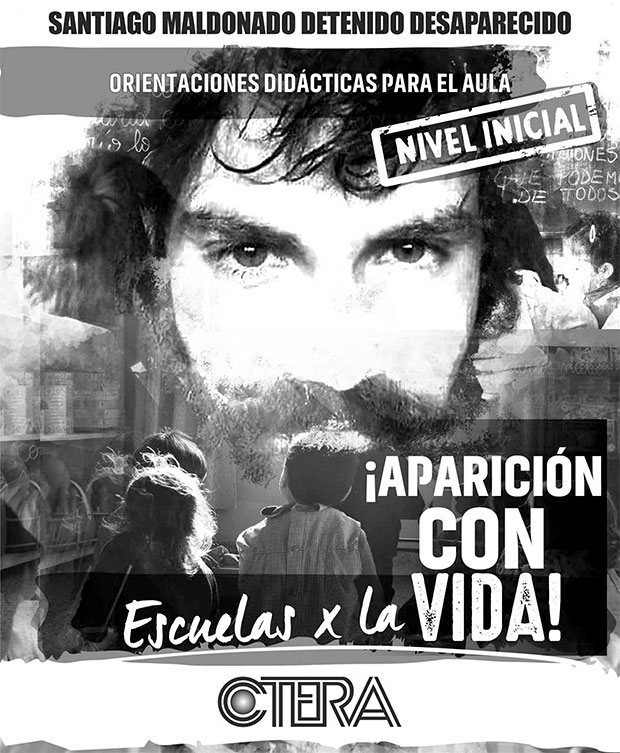 La&nbsp;Confederación de Trabajadores de la Educación de la República Argentina (CTERA)<a href="http://www.ctera.org.ar/index.php/prensa/noticias-prensa/item/2790-ctera-impulsa-una-campana-nacional-desde-cada-una-de-las-escuelas-del-pais-donde-esta-santiago-maldonado">&nbsp;</a><a href="http://www.ctera.org.ar/index.php/prensa/noticias-prensa/item/2790-ctera-impulsa-una-campana-nacional-desde-cada-una-de-las-escuelas-del-pais-donde-esta-santiago-maldonado">impulsa una campaña</a> en todas las escuelas del país para tratar el caso Santiago Maldonado como "desaparición forzada" y responsabiliza a la Gendarmería por el hecho.&nbsp;Para eso, el sindicato propuso desde clases abiertas hasta cuadernillos para los diferentes niveles. Las acciones empezarán este miércoles 30 de agosto, cuando se conmemora el Día Internacional del Detenido Desaparecido. De este modo, la CTERA exige "la inmediata aparición con vida de Santiago Maldonado".Habrá trabajos en el aula, banderas a media asta, y se incluirá su nombre en todas las listas de asistencia. Además, se expondrán fotos del hombre que es buscado desde el 1° de agosto cuando la Gendarmería intervino en un corte de ruta durante una protesta mapuche en Chubut. También proponen radios abiertas, siluetazos, expresiones artísticas y exposición de los trabajos hechos en las escuelas en las plazas."Exigimos desde cada escuela del país: ¡Aparición con vida de Santiago Maldonado YA! ¡Juicio y castigo a lxs culpables!", es la consigna que sostiene la Confederación.En medio de los cruces entre la familia, el Gobierno Nacional y los organismos de Derechos Humanos, los trabajadores de la educación presentaron cuadernillos específicos para cada nivel educativo.El contenido da por hecho la responsabilidad del Estado en la desaparición del joven y busca que los chicos se relacionen con conceptos como la solidaridad, la lucha de los pueblos originarios por la tierra, y el derecho a manifestarse.Bajo el subtítulo, "¿Quién es Santiago Maldonado?", el cuadernillo del Nivel Inicial propone mostrarles fotos de Maldonado a los chicos para "ponerles nombre a las personas, y entendernos como sujetos con derechos".El material para el nivel primario habla del caso Maldonado como "desaparición forzada" y equipara los gobiernos dictatoriales con la actualidad. En el punto 3, donde se plantean los objetivos, proponen indagar "sobre las actividades de represión, control o censura hacia la cultura".Otros ejercicios son la "identificación de las formas de resistencia y reclamo de organismos defensores de Derechos Humanos por Santiago Maldonado o selección de evidencias obtenidas de revistas, diarios y documentales sobre los hechos ".Fuente: Medios Digitales
