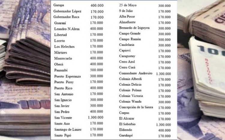 Mediante el decreto Nº 1049 del pasado 26 de julio, el Gobierno provincial transfirió casi 15 millones de pesos a un total de 47 municipios para “atender desequilibrios financieros”.Se trata de aportes “no reintegrables” y “no afectados a obras públicas” que figura en el decreto como aporte del Ministerio de Interior y Obras Públicas de la Nación en base a la resolución nacional N° 457/17 del mencionado Ministerio, que conduce Rogelio Frigerio. Los fondos se canalizaron a través del Ministerio de Gobierno de Misiones como “Aportes a Municipalidades y Otros Entes Comunales” para “afrontar el pago de los gastos emergentes de la Ejecución del Presupuesto”, se describe en el decreto. El artículo 4 señala: “ Otórgase en carácter de transferencia sin reintegro con destino a atender desequilibrios financieros con cargo de oportuna y documentada rendición de cuentas ante el Honorable Tribunal de Cuentas de la Provincia la suma de $14.490.000 a los diferentes Municipios conforme lo indicado en Planilla Anexa”. Comandante Andresito, El Soberbio y San Vicente fueron los más beneficiados con 1,7 millones de pesos para cada uno. El resto recibió sumas variadas entre 400 mil, 300 mil o 170 mil pesos. El decreto se publicó en el boletín oficial de Misiones el pasado viernes 25 de agosto. No hay ningún detalle que explique porqué se beneficia a unos y no a otros municipios ni tampoco el criterio utilizado para repartir los fondos que no deberán reintegrarse y que servirán para atender los desequilibrios financieros de los intendentes. Ese mismo día se conoció otro decreto provincial, el Nº 965 del 11 de julio por medio del cual se otorgó al municipio de Comandante Andresito la suma de $1.500.000 “en carácter de transferencia sin reintegro y con destino a atender desequilibrios financieros con cargo de oportuna y documentada rendición de cuentas”.