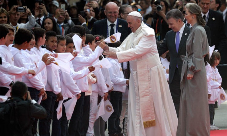 El papa Francisco pidió a los jóvenes colombianos que no se dejen vencer ni engañar y que no pierdan la alegría, en las primeras palabras que dirigió a las personas que se agolparon en la sede de la Nunciatura Apostólica en Bogotá.Francisco llegó este miércoles a Colombia, donde permanecerá hasta el 10 de septiembre y tras la ceremonia de bienvenida en el aeropuerto militar de Catam en Bogotá se subió al papamóvil y recorrió 15 kilómetros hasta llegar a la Nunciatura, donde residirá estas cuatro noches. A su llegada, el pontífice se dirigió a la multitud que le esperaba e hizo referencia a las cientos de miles de personas que se agolparon durante su recorrido.Sobre todo se dirigió a los más jóvenes y les dijo “no se dejen vencer, ni engañar, ni pierdan la alegría, ni la esperanza y la sonrisa”, les dijo el papa argentino a su llegada y que después volvió a repetir a los jóvenes.Para esta improvisada “plaza de San Pedro” se instaló un pequeño palco y una zona para la prensa en el exterior de la Nunciatura. En esta primera “audiencia” en Bogotá recibió a miembros del Instituto Distrital para la Protección de la Niñez y la Juventud (Idipron), y algunos de estos niños le cantaron.También hubo miembros de las Familias de la Misericordia (Famis), un grupo de laicos y sacerdotes católicos, que se dedican a obras en favor de los más necesitados.Francisco recibió una ruana, el tradicional poncho colombiano, que los jóvenes de Idipron han tejido personalmente, y no dudó en ponérsela.Después el pontífice argentino se retiró a descansar tras las 12 horas de viaje.El momento álgido de la visita de Francisco se producirá este viernes cuando habrá una reunión y una oración de reconciliación entre las víctimas del conflicto y exguerrilleros en Villavicencio, una ciudad al sur de Bogotá rodeada por territorios controlados durante años por las FARC. A un año de que el gobierno de Bogotá rubricara un acuerdo de paz con esta guerrilla, el país sigue dividido por los términos del pacto. Incluso la jerarquía de la Iglesia católica, que fue clave para facilitar las conversaciones de paz y ahora encabeza el proceso de reconciliación, tiene posturas contrastantes, por lo que muchos colombianos consideran que son unos términos demasiado generosos para los rebeldes responsables de atrocidades.El pontífice además beatificará a dos sacerdotes colombianos asesinados durante las décadas de conflicto con los rebeldes, declarándolos “mártires” víctimas del odio a la fe católica.Santos pide dejar de lado las diferenciasEl presidente de Colombia, Juan Manuel Santos, invitó a sus compatriotas a aprovechar la visita del papa para dejar de lado las diferencias y trabajar juntos en busca de “lograr grandes cosas”. “Es el momento de que aprovechemos esta visita para que quienes tengamos diferencias las hagamos a un lado o respetémoslas y trabajemos juntos, un país con un inmenso futuro, y si trabajamos juntos vamos a poder lograr grandes cosas”, declaró Santos.Fuente: NA