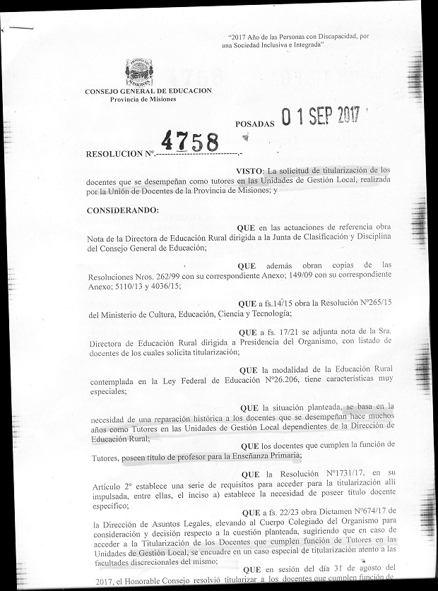 En una maratónica sesión, el Consejo General de Educación (CGE) titularizó a más de 40 maestros de primaria en horas del Nivel Medio. Esto no solo pasa por alto la Ley de Estatuto Docente sino incluso la Resolución 1731 que dispuso el actual proceso de titularización masiva.   El 4 de mayo de este año, este mismo organismo, estipuló a través de la Resolución 1731 que para ser titularizado era necesario “poseer título docente específico para el cargo u horas cátedra por el cual accederá a la titularización”. Nada menos específico que un título de Profesorado para la Enseñanza Primaria para ocupar horas cátedra de la secundaria. Según denunció la Unión Docente Nueva Argentina de Misiones (Udnam), el primer día de este mes el CGE aprobó dos resoluciones (la 4.758 y la 4.765) en las que titularizó a 43 maestros como tutores y coordinadores en horas de secundaria. “En ambas resoluciones llama poderosamente la atención que se pasa por alto la consulta a la Junta de Clasificación y Disciplina de la Rama Media, este no es un dato menor pues ese organismo es quien debe confirmar si los docentes reúnen los requisitos establecidos en la Resolución 1731”, destacó en diálogo con PRIMERA EDICIÓN la secretaria general de Udnam, Estela Genesini.      Resolución 4.765 En esta resolución, el CGE titularizó a siete maestros en un total de 80 horas de cátedras del nivel secundario como tutores y coordinadores del Ciclo Básico Secundario Rural en las Unidades de Gestión Local (UGL) 2, 5, 7, 10 y 3. No figura en ese documento la intervención de la Junta de Clasificación y Disciplina dando cuenta si los docentes reúnen o no los requisitos. Resolución 4.758En esta titularización tampoco participa la Junta de Clasificación y Disciplina. Pero sí aparece la Dirección de Asuntos Legales entre sus considerandos, donde se pone a consideración el Dictamen 674/17 en el que se sugiere que “en caso de acceder a la titularización de los docentes que cumplen función de tutores en las Unidades de Gestión Local, se encuadre en un caso especial de titularización atento a las facultades discrecionales del mismo”. La misma resolución estipula que los docentes que cumplen la función de tutores poseen título de profesor para la Enseñanza Primaria pero aduciendo este “caso especial” que no está previsto en la Resolución 1.731 se titularizó de un plumazo a 36 maestros en un total de 331 horas cátedras de la UGL 6, 8, 10, 11, 12, 13, 14, 15, 9, 1, 2, 3, 4 y 5.    Ambas resoluciones llevan la firma del presidente del Consejo General de Educación (CGE), Mauricio Maidana; y de la secretaria general del organismo, Norma Beatríz Cuquejo.