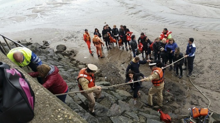 Más de 123 docentes que habían salido a navegar en un catamarán desde el puerto de Olivos para festejar el Día del Maestro debieron ser rescatados este lunes tras haber quedado varados a unos 300 metros de la costa, en medio de una pronunciada bajante del río de la Plata.Efectivos de Prefectura Naval guiaban en grupos de 20 personas a los pasajeros por el río, que tiene apenas unos 20 centímetros de profundidad, de regreso a tierra firme.Según informó el prefecto Horacio Aranda, el catamarán contratado por los maestros de la zona sur del conurbano para festejar su día partió a la 1:15 del Puerto de Olivos y poco después se produjo su varadura "sin peligro para los pasajeros, la tripulación y la embarcación".A partir de la mañana, Prefectura inició un operativo de rescate por medio de un cabo de seguridad por el que los pasajeros son guiados a la costa, todos ellos con chaleco salvavidas colocados.Hasta este mediodía habían sido rescatados más de cincuenta docentes de los 120, indicó el oficial al canal TN.Fuente: Noticias Argentinas