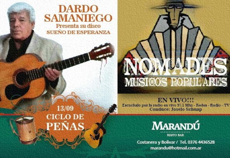En el ciclo de peñas organizadas por Nómades Músicos Populares, el miercoles a las 21 en Marandú Resto Bar, se presenta el músico Dardo Samaniego con su nuevo material discográfico "Sueño Esperanza" con lo mejor de la música folclórica.
