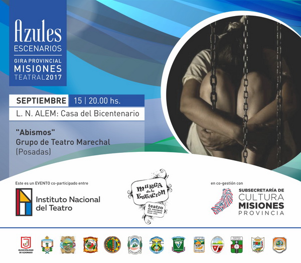 Este fin de semana se realizará la gira de dos obras seleccionadas en concurso en el marco de la Gira Provincial Misiones Teatral "Azules Escenarios ".En esta oportunidad, el grupo de Teatro "Marechal" presentará su obra "Abismos" de Silvia Gonzales. La función será el viernes 15 de Septiembre a las 20 hs en la Casa del Bicentenario de Leandro N. Alem. Ese mismo día, a las 21, el grupo “Arbolesminí" presentará el espectáculo “Las Fauces" en el Galpón de la Murga del Monte de Oberá. Además, los elencos brindarán un taller para las comunidades teatrales de dichas Localidades. En este sentido, el grupo Marechal dictará a las 14.30, un taller de "entrenamiento actoral" en la Casa del Bicentenario de Alem y el viernes 15, el Grupo Arbolesminí dictará la temática "La puesta en escena según el modo de producción " en el Galpón de la Murga del Monte de Oberá. Luego continuará el sábado 16 en el Teatrtro de Los Cajones de Puerto Rico. Estos encuentros se realizan en coparticipación entre el Instituto Nacional de Teatro y la Asociación civil ” Grupo de la Estación” y co gestionado con la Subsecretaría de Cultura de la Provincia, a cargo de Lucía Mikitiuk y los Municipios involucrados.Cabe recordar que esto se desarrolla en el marco del Plan del Instituto Nacional de Teatro, donde fueron seleccionados 10 elencos que recorrerán la provincia a través de 28 presentaciones.