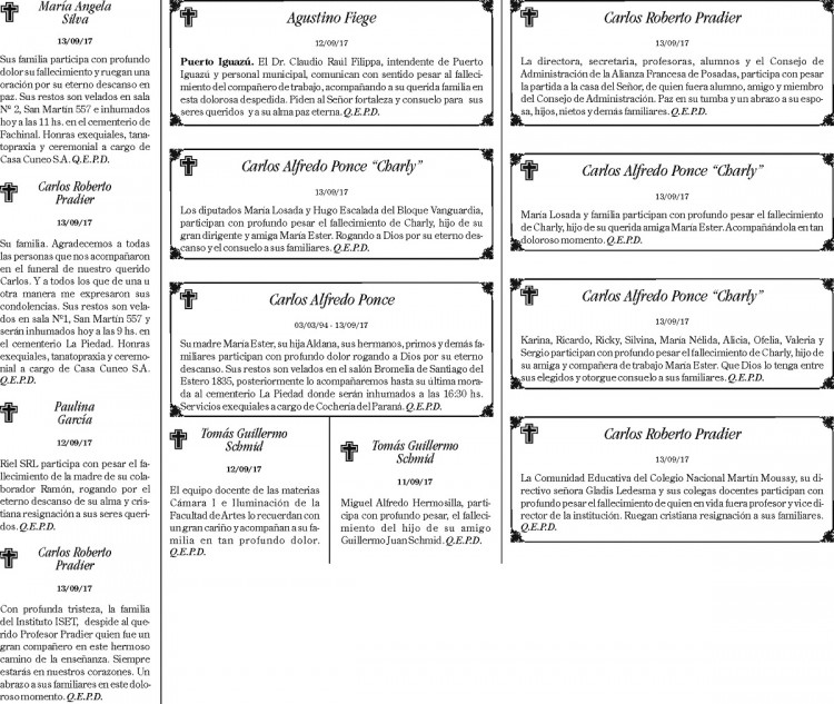 Fúnebres del jueves 14 de septiembre de 2017