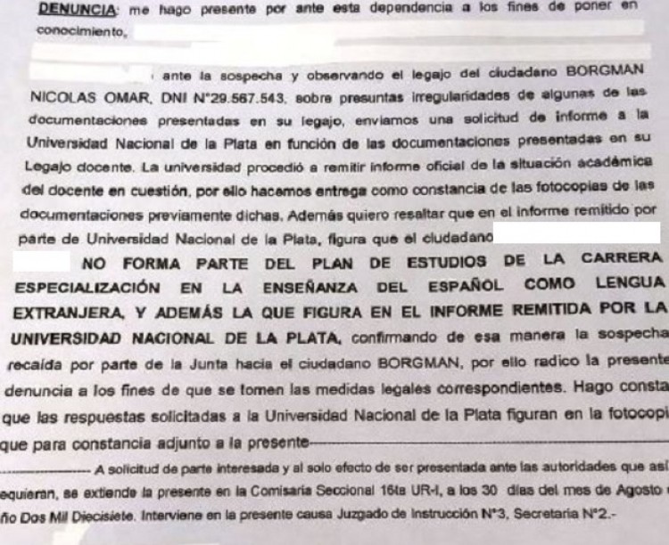 El director del Centro Educativo Polimodal (CEP) 53, Nicolás Borgman, accedió a ese cargo con un legajo inflado y con certificados truchos de especializaciones que nunca realizó en la Universidad de La Plata, según confirmó esa casa de altos estudios a la Junta de Clasificación y Disciplina Rama Media, del Consejo General de Educación (CGE).&nbsp;Según confirmó a PRIMERA EDICIÓN el presidente de ese organismo, Marcos Freaza, realizaron la denuncia correspondiente contra Nicolás Borgman ante la Comisaría Seccional Décimo Sexta el pasado 30 de agosto. Acompañaron la denuncia con los documentos emitidos por la Universidad Nacional de La Plata donde confirmó formalmente que los documentos que forman parte del legajo del docente son falsos.El primer día de julio pasado, la Junta de Clasificación y Disciplina confirmó a este diario que, <a href="http://www.primeraedicion.com.ar/nota/250139/denuncian-a-docente-por-presentar-un-titulo-de-profesorado-apocrifo-.html">tal como había publicado un mes antes</a>, el título de profesora de Tatiana Borgman era falso.&nbsp;Después de ello, el organismo <a href="http://www.primeraedicion.com.ar/nota/253262/solicitan-que-tambien-se-investigue-al-hermano-de-la-docente-con-tit.html">procedió a abrir de oficio el legajo de su hermano, director del CEP 53</a>, y sospechó que también contenía numerosos certificados apócrifos. Por ello, solicitó a la Universidad Nacional de La Plata que constatara sus credenciales académicas en la &nbsp;Especialización en la Enseñanza del Español como de Lengua Extranjera.Once certificados falsos&nbsp;En los documentos que acompañan la denuncia realizada en la sede policial, se establece que Nicolás Omar Borgman no registró asistencias al Seminario Métodos de Investigación de la Enseñanza de Lengua Extranjera, ni al Seminario sobre Diseño de Unidad Didáctica, ni al Seminario Español con Fines Específicos, ni al Seminario Medios Aplicados a la Enseñanza de Lenguas Extranjeras.&nbsp;No obstante, según constató esa casa de altos estudios, Borgmann sí cursó Contexto Sociocultural de la Argentina a partir del Siglo XIX en la Enseñanza de ELSE pero no presentó el trabajo final integrador. Esto es parte de la respuesta de la institución a las autoridades misioneras, de un total de 11 certificados falsos.Acciones administrativas&nbsp;y judicialesEn lo administrativo, el director de la 53 deberá enfrentar el inicio de un sumario administrativo que podrá determinar a mediano plazo su exoneración del sistema educativo. Su hermana ya enfrenta el mismo proceso administrativo iniciado hace poco más de dos meses, pero aún el CGE no dio a conocer su decisión sobre su situación. No obstante, en el caso de Tatiana, renunció a su cargo por lo que ya no está frente a los alumnos. El director, sin embargo, aún está al frente de la dirección de la escuela.&nbsp;Ambos deberán enfrentar la investigación de la Justicia Penal.&nbsp;De los dos hermanos, el que más tiene para perder es Nicolás Borgman, quien no sólo quedaría fuera del sistema educativo del Nivel Medio y Superior sino también de la Universidad Nacional de Misiones (UNaM). Vale recordar que este año rindió un concurso docente en la Facultad de Humanidades y Ciencias Sociales en el que quedó con igual puntaje que otra docente. Luego de ese concurso, Borgman gestionaba para que le concedan el derecho a la herencia del cargo docente. &nbsp;