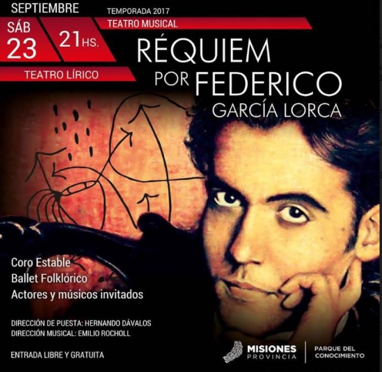 Este homenaje multidisciplinar contará con la participación de los actores Alejandro Schöller, Mariano Bernachea y Paula Parodi, y los relatos en las voces de Cristina Cubilla, Gricelda Rinaldi y Benito del Puerto. La lista de artistas se completa con los guitarristas: Marcos Domanchuk y David Luna. La dirección de puesta estará a cargo de Hernando Dávalos y la dirección musical bajo la batuta de Emilio Rocholl. Lorca fue una leyenda en vida. Su obra está atravesada por un profundo sentido de lo popular español, que atiende tanto a saberes, creencias y sentimientos como al modo de celebración de la vida y la muerte.“El homenaje a Lorca partió de la selección de las obras que están musicalizadas por distintos compositores y poetas. Se busca abordar fragmentos de su obra a través de distintas expresiones artísticas. Se recitarán poesías, se cantarán obras corales, habrá danza, música y proyecciones audiovisuales”, adelantó Hernando Dávalos. La invitación se extiende al público misionero. La cita es para el sábado 23 de septiembre a las 21 hs. en el Teatro Lírico del Parque del Conocimiento, con entrada libre y gratuita.