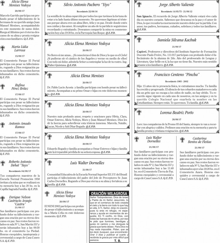 Fúnebres del viernes 22 de septiembre de 2017