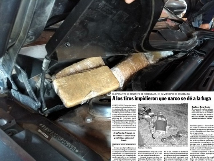 La del sábado por la mañana no fue "la primera vez" del comerciante domiciliado en Oberá con el narcotráfico: el hombre de 49 años <a href="http://www.primeraedicion.com.ar/nota/256403/cayo-banda-oberena-que-traficaba-droga-a-chile-haciendose-pasar-por-.html">apresado como líder de la organización que traficaba marihuana hacia Chile</a> ya había sido detenido en 2012, en Candelaria, ligado al tráfico de estupefacientes. Y curiosamente, en el mismo?Renault Scenic que ahora está nuevamente a disposición de la Justicia Federal.A través de sus fuentes, PRIMERA?EDICIÓN?pudo establecer que el sospechoso incluso purgó una condena a cuatro años y medio de prisión por aquella detención, la que se agotó hace menos de nueve meses. Sin embargo, todo indica que el acusado no supo aprovechar su segunda oportunidad.Este?Diario reflejó en su momento aquella primera detención del comerciante radicado en Oberá pero oriundo de Monte Caseros, en Corrientes, que se produjo en la madrugada del jueves 19 de abril de 2012 sobre la ruta nacional 12, cerca del Cementerio de Candelaria, a 20 kilómetros de Posadas.Ya desde la noche anterior, efectivos de Prefectura realizaban patrullajes en la zona, cerca del río Paraná, cuando notaron una embarcación a remos con cinco sospechosos que se acercaba a la costa argentina. Del expediente surge que los mismos desembarcaron en Puerto Lapachito, sobre el kilómetro 1.607 del cauce.Ante tal situación, los uniformados montaron un operativo cerrojo, razón por la que montaron una vigilancia encubierta sobre el kilómetro 1.370 de la ruta nacional 12, cerca del acceso al “campo santo” de la “Antigua Capital”.Los prefecturianos siguieron con binoculares de visión nocturna los movimientos de los “narcos”. Notaron entonces cómo los sujetos transportaban los bultos por una zona de pinos hasta abandonarlos a no más de diez metros de la mencionada arteria asfaltada.Posteriormente, percibieron que un automóvil que se desplaza por la ruta hacia el sur comenzó a hacer seña de luces, las que fueron respondidas por los “narcos” desde el pinar con una suerte de luz azulina. No era una coincidencia:?a los pocos minutos, ese mismo auto sospechoso volvió a pasar por el lugar en sentido contrario. Y volvió a hacerlo una tercera vez, aunque ahora se detuvo en la banquina, el conductor se bajó y abrió el baúl.Fue en ese preciso momento que los uniformados entraron en acción. Ante la voz de “Alto Prefectura”, quienes habían llegado por el río lograron perderse en una zona de espesa vegetación.?El conductor del auto sospechoso, en tanto, regresó al volante y aceleró con firmes intenciones de darse a la fuga. Fue allí que los uniformados abrieron fuego, alcanzaron uno de los neumáticos y lograron apresar al automovilista.En familiaEse hombre resultó ser el mismo comerciante de Oberá apresado el sábado último en la localidad correntina de Loreto. Y, vaya paradoja, el auto en el que circulaba aquella noche es el mismo en el que fue apresado junto a su concubina hace menos de dos días, tras confirmarse que posee la misma patente, cuya combinación alfanumérica no se publica para no entorpecer la investigación.De regreso a 2012, lo cierto es que los uniformados incautaron a un costado de la ruta y a escasos metros del Renault un total de 160,910 kilogramos de marihuana que el sospechoso aparentemente intentaba cargar en&nbsp; el automóvil.Por aquel procedimiento, el comerciante llegó a juicio oral y público. El debate se desarrolló ante el Tribunal Oral en lo Criminal Federal de Posadas y finalizó el 15 de abril de 2014 con sentencia condenatoria. Es que fue hallado responsable del delito de “contrabando de importación de estupefacientes” y sentenciado a cuatro años y medio de prisión.En aquella oportunidad, tras la retención correspondiente, el Renault Scenic fue entregado en depósito a la concubina del condenado bajo una serie de obligaciones y restricciones.&nbsp;Justamente esa mujer fue una de las cinco personas detenidas el sábado pasado en Loreto, a bordo del mismo Scenic que era conducido por su concubino, comerciante y reconocido arquero del fútbol de veteranos de Oberá.La pareja, el hijo de la mujer y otros dos jóvenes, todos con domicilio en esa última localidad, están acusados de conformar una banda que enviaba marihuana desde Misiones hacia Chile, vía Córdoba.&nbsp;Una investigación ordenada por el Juzgado Federal 1 de Corrientes y llevada a cabo por personal de la Dirección de Toxicomanía de la Policía de Misiones y Prefectura terminó con la detención de todos los sospechosos. En el caso del exconvicto, quedó una vez más en manos de las autoridades.