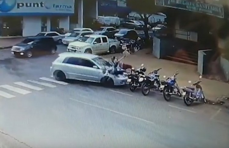 Imágenes de un circuito cerrado de videocámaras de seguridad captaron el momento de un impactante siniestro vial ocurrido a primeras horas de este jueves en la esquina de la Séptima Región Sanitaria de Encarnación (Paraguay), en la intersección de las calles Honorio González y Jorge Memmel.La grabación muestra el momento en el que dos mujeres cruzaban la calle y la conductora de un automóvil que ingresaba a esa arteria, y que quiso frenar al verlas, se confundió, apretó el acelerador y las terminó arrollando con violencia.A una de las víctimas el impacto la lanzó contra un par de motocicletas estacionadas en las inmediaciones, mientras que la otra fue arrastrada sobre el capot del vehículo, que subió a la vereda y terminó su marcha contra un muro.A pesar de la violencia del episodio, ninguna de las mujeres resultó herida de gravedad y la más comprometida, de 34 años y trabajadora de la Séptima Región Sanitaria, solo sufrió una fractura en un dedo del pie y ya fue dada de alta del Hospital Regional de Encarnación.Fuente y Video: Itapúa en Noticias