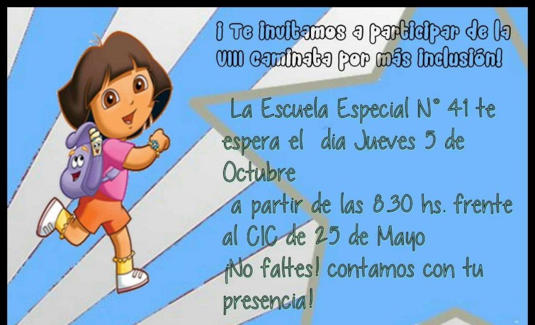 La Escuela Especial N°4 de la localidad de 25 de Mayo invita a la Comunidad a participar de la "8va edición de la caminata Por Más Inclusión", a realizarse el jueves 5 de octubre a partir de las 8. 30.Participarán: padres, docentes y alumnos de distintas escuelas primarias y secundarias de la zona, quienes partirán desde Centro Integral Comunitario (CIC) hasta el salón de la Iglesia Católica. La iniciativa fue declarada de interés municipal y busca generar, un espacio más que fomente la inclusión de las personas con discapacidad como sujetos de derecho, en una actividad que celebra la vida. Luego de la caminata, en el salón parroquial los presentes compartirán números artísticos, sorteos y mucha alegría! Los esperamos.