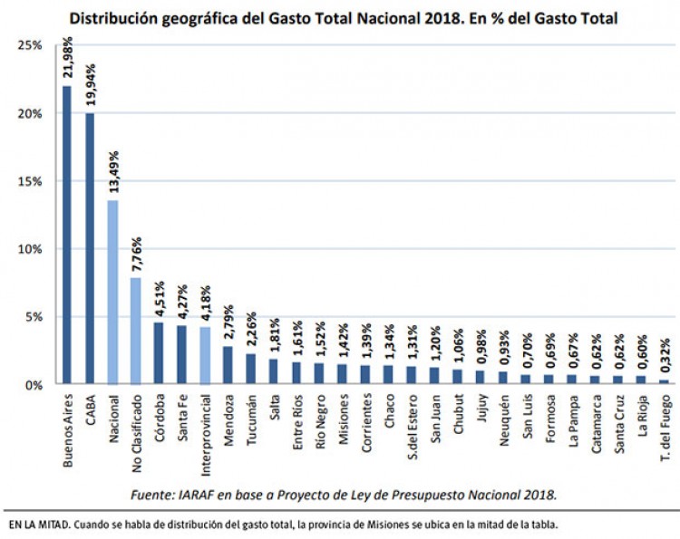 De acuerdo a un informe detallado del Instituto Argentino de Análisis Fiscal (IArAF), la provincia de Misiones recibirá solo el 1,42 % del total del gasto nacional en 2018, según el proyecto de presupuesto que envió el presidente Mauricio Macri para su aprobación en el Congreso de la Nación.En los próximos días se dará inicio al debate en las comisiones y la expectativa está puesta en la labor de los legisladores nacionales por esta provincia para ver si logran incrementar la pequeña tajada que le toca a los misioneros, aunque la mayoría de ellos están inmersos en la campaña política, dedicándole menos tiempo a la tarea legislativa. El informe se denomina “El mapa de la obra pública nacional presupuestada para 2018” y señala que “el 25% del gasto no tiene una asignación provincial específica. Del resto, más del 40% del gasto presupuestario se concentra en Buenos Aires (22%) y en CABA (20%). Luego aparecen Córdoba (4,5%) y Santa Fe (4,3%). Hay 12 provincias argentinas (la mitad de jurisdicciones) a las que tomadas en conjunto se asigna menos del 10% del gasto.”El IARAF conformó un mapa con la distribución geográfica del gasto total nacional 2018 por provincia (ver recuadro) donde se observa a Buenos Aires con el 21,98% recibiendo más que todo el resto. Luego CABA con 19,94%; el gasto nacional será de 13,49%; no clasificado será de 7,76%; Córdoba 4,51% y el resto. Misiones se ubica en la mitad de la tabla con 1,42% superando a Corrientes, Chaco, Santiago del Estero, San Juan y otras. “Si se toma el promedio del gasto por habitante proyectado con asignación en provincias, el ordenamiento provincial es muy diferente al que se presenta en el gráfico anterior”, indica el informe. En este ordenamiento, Misiones aparece peor ya que se ubica en el puesto ante último, sólo superando a Chaco. En todo el año próximo, cada habitante de esta provincia recibirá servicios o programas provenientes de la Nación por 33.377 pesos, en tanto, los ciudadanos más beneficiados son los de Caba con 188 mil pesos per cápita y luego Río Negro con 60 mil pesos cada uno. “Provincias que figuran entre las últimas en el listado de participación en el gasto total, como Tierra del Fuego o Santa Cruz, se ubican ahora como las más favorecidas considerando el gasto por habitante de dichas regiones. Buenos Aires, Santa Fe y Córdoba quedan en este indicador por debajo del promedio”, agrega el informe. Inversión real directaLuego se analiza la inversión real directa por habitante donde Misiones, nuevamente se encuentra entre los cuatro últimos, recibiendo 607 pesos por habitante, superando solo a Chaco, Santiago del Estero y Tucumán, mientras que en el otro extremo Río Negro es la más beneficiada con 6.645 pesos. “Si se considera el gasto presupuestado en Inversión Real Directa para el 2018, se tiene que Río Negro, CABA, La Pampa y Tierra del Fuego serán las principales jurisdicciones receptoras de este gasto, que en términos per cápita superaría con creces a la media prevista para el consolidado provincial de $1.399 por habitante”, describe el informe.