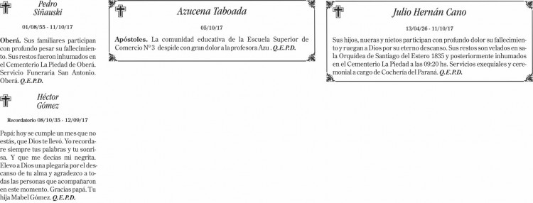 Fúnebres del jueves 12 de octubre de 2017