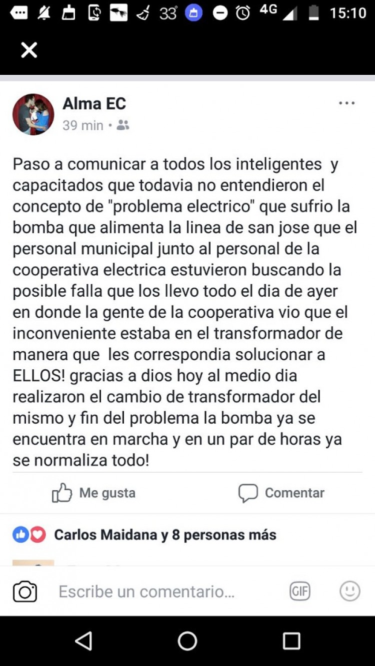 Los vecinos comentaron a PRIMERA EDICIÓN que siguen sin agua potable en varios barrios como consecuencia de que un rayo afectó un transformador de la cooperativa proveedora. La cuestión es que ellos llevan tres días sin el vital líquido y se enteraron de los motivos por los medios. Se quejaron también porque desde la Comuna local aún no los han asistido para sobrellevar este período de falta. El intendente Jorge Lezcano explicó este jueves a este Diario que "la cooperativa estaba trabajando para solucionar el problema, pero no todo Puerto Piray está sin agua". Según los vecinos son por lo menos cinco los barrios que no cuentan con el vital líquido. Asimismo, la secretaria de Obras Públicas de la Comuna Alma Cristaldo, comunicó por Facebook que "el problema estaba solucionado".