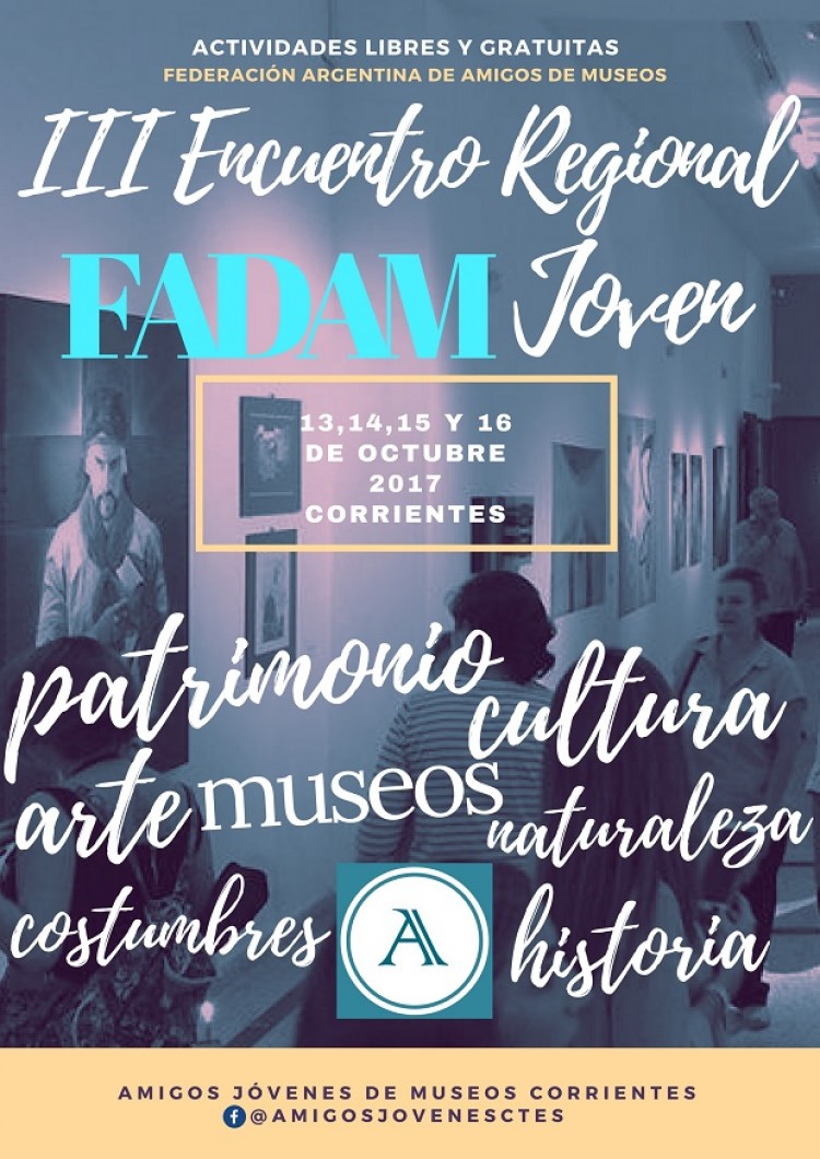 El encuentro comenzará este viernes a las 13 y finalizará el lunes 16 de este mes luego de cuatro jornadas de mesas de trabajo y visitas guiadas a los museos Histórico, Bellas Artes, Arqueológico y Antropológico, Artesanías, Ciencias Naturales, Teatro Vera y sitios patrimoniales, entre otros.  El programa incluye actividades libres y gratuitas almuerzos, cenas, paseos costeros y excursiones hacia Concepción y Santa Ana, ambas dos localidades ampliamente valoradas por el estado de conservación de su patrimonio natural, histórico y cultural. El evento tiene por objetivo “poner en valor el patrimonio cultural y natural" del país, "difundiéndolo y promoviendo su conservación para las nuevas generaciones”.En Corrientes, este encuentro es organizado por el grupo de jóvenes de la Asociación de Amigos de los Museos de Corrientes con sedes en los Museo de Bellas Artes “Dr. Juan Ramón Vidal” y Museo Histórico “TTE Gobernador Manuel Cabral de Melo y Apolín” y la Federación Argentina de Amigos de Museos -FADAM-.Encuentros similares se han llevado a cabo en Capital Federal, Mar del Plata, Córdoba, San Juan, organizados para todo el país por grupos de jóvenes amigos de museos en cada ciudad.  "Somos un grupo de jóvenes voluntarios que trabajamos para promover las riquezas patrimoniales de nuestra región. Nuestro trabajo se centra principalmente en impulsar a otros jóvenes a acercarse a los museos generando actividades que permitan redescubrirlos", indica el grupo organizador. "Todos los años, la Federación Argentina de Amigos de Museos fomenta la realización de un encuentro para jóvenes que sientan curiosidad por la historia, el arte, la arquitectura, la naturaleza, con el objetivo de motivarlos a sumarse a esta iniciativa", invita. "Este años nos tocó a los correntinos llevar adelante este desafío. De más está decir que armamos un programa que, además de permitirnos disfrutar de todo lo que tiene para ofrecer Corrientes, nos da la posibilidad de generar lazos de amistad, intercambiar ideas y conocer un poco más de qué se trata esto de ser amigo de un museo", propone.