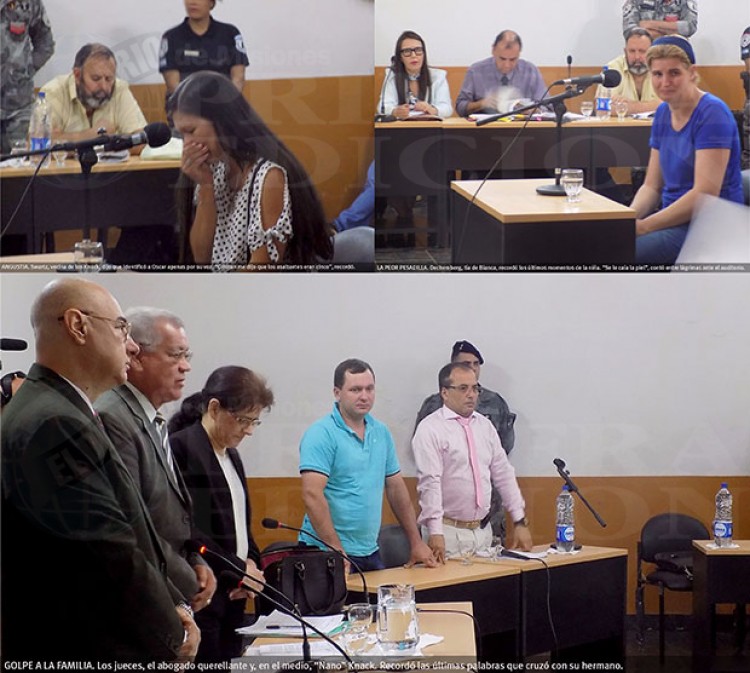 ntos financieros, pero jamás pude ubicar quién era. Son muchos cuadernos. También me dijo que eran cuatro o cinco los ladrones, con guantes a los cuales les recortaron la parte de los dedos”, rememoró.Consultado acerca de quién o quiénes podían estar al tanto de la transacción comercial que hizo su hermano Cristian el día del hecho -quien acababa de llegar con 400 mil pesos que había cobrado por la venta de una carga de madera-, “Nano” afirmó que “nadie podía saber porque era algo familiar y privado. “Era habitual que cada tanto algún integrante de la familia viajara para realizar operaciones donde se manejaba dinero”, contó, tras lo cual agregó que no sabe cómo “alguien pudo enterarse” y, en ese sentido, dijo que no había problemas con empleados o exempleados de la empresa.“Nos asaltaron, nos quemaron”A su turno, Gisella Swartz (35), la dueña de la casa donde Oscar Knack fue a pedir ayuda, relató que fue ella quien lo reconoció. “Todos dudaban de quién era la persona que golpeó la ventana. Les dije que era Oscar por la voz, lo reconocí por la voz…”, dijo la mujer, quien también rompió en llantos en medio de la declaración.Mientras los dos hombres que estaban con ella fueron rápidamente a ver qué ocurría en la casa de los Knack, relató que quedó a solas con Oscar. “Afuera llovía y había mucha niebla. Él decía ‘nos asaltaron, nos quemaron, están todos afuera…llamale a ‘Nano’, que venga urgente. Me la van a pagar, por lo que le hicieron a mi hija, por lo que le hicieron a mi familia… la van a pagar’”.Luego la mujer recordó que la última imagen que tiene de padre e hija -Oscar y Bianca- son los gritos de dolor en la guardia del Samic de Oberá. “La nena pidiendo por su papi… gritando de dolor y pidiendo por su papi”, sentenció antes de quebrarse nuevamente. Un dato no menor que aportó ayer Swartz fue que aseguró que, camino al hospital, Cristian Knack le dijo que “los asaltantes eran cinco y que reconoció a uno, todos con alpargatas blancas. Pero no me dio nombre, apellido o apodo del que reconoció. Tampoco lo describió”.También declararon ayer Miriam Ritcher (24), quien en ese entonces era novia de “Nano” Knack y actualmente es su esposa, y su hermano, José Ritcher (29).Hizo lo propio, además, José Serfas, dueño de la casa donde fue a pedir ayuda Oscar Knack y el sobrino de éste, Germán Mojfiuk (29). Éste último dijo ante el tribunal que Cristian Knack le contó de un automóvil VW Bora que vio en la escena, “bordó u oscuro”. La enfermera, testigo clavePara hoy a las 8.30 está previsto que se reanude el juicio oral y público por la “Masacre de Panambí”. Entre los siete testigos citados figura como testimonio excluyente el de la enfermera que presenció la denuncia de Cristian Knack en el hospital Madariaga de Posadas, tras una leve mejoría y antes de morir. También declarará la pareja del joven, quien lo acompañó a realizar la transacción comercial a Cuatro Bocas (Corrientes), el mismo día del brutal cuádruple homicidio.