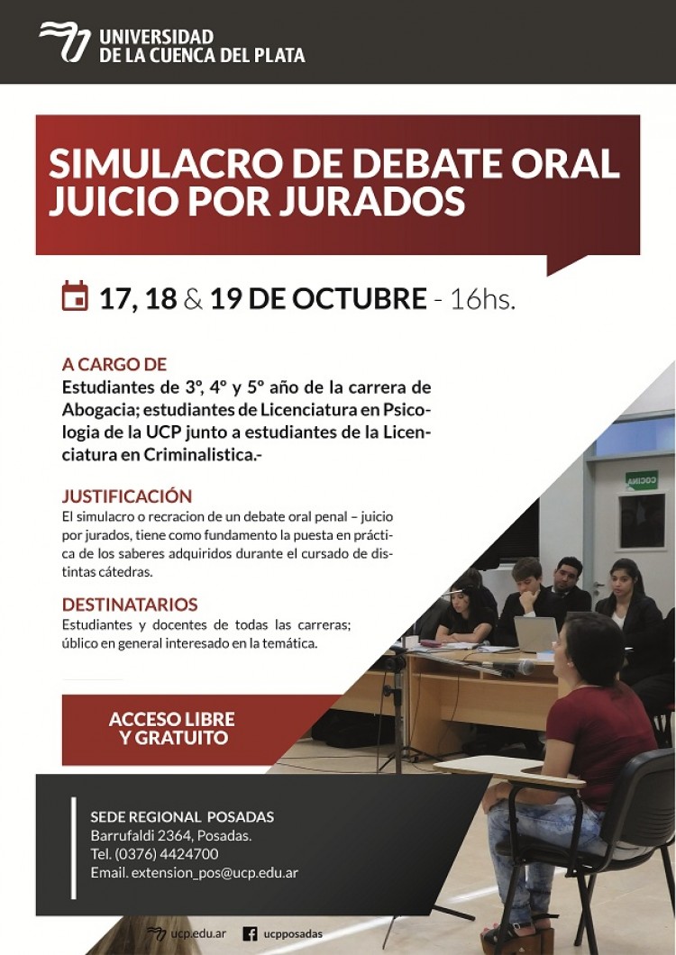 Las carreras de Abogacía y Licenciatura en Psicología de la Universidad de la Cuenca del Plata Sede Regional Posadas organizan Simulacro de Debate Oral – Juicio por Jurados. La actividad se desarrolla desde el martes 17 al jueves 19 de octubre, de 16 a 20hs, es abierta a la comunidad y de carácter gratuito.La Universidad de la Cuenca del Plata Sede Regional Posadas invita a la comunidad a presenciar el Simulacro de Debate Oral – Juicio por Jurados organizado por las carreras de Abogacía y Licenciatura en Psicología de la Universidad de la Cuenca del Plata Sede Regional Posadas-UCP- que se desarrolla en el edificio de la Casa de Estudios – sita en Barrufaldi 2364- desde el miércoles 17 y finaliza el jueves 19, extendiéndose en tres jornadas consecutivas de 16 a 20hs, con la participación de estudiantes de 3º, 4º y 5º año de la carrera de Abogacía , de la Lic. en Psicología de la UCP y estudiantes de la Licenciatura en Criminalística, que oficiarán de actores en la representación del Simulacro de Juicio Oral por Jurados.Desde la Facultad de Ciencias Jurídicas y Políticas de la UCP explican que el Simulacro tiene como fundamento la puesta en práctica de los saberes adquiridos durante el cursado de las algunas asignaturas de la carrera de Abogacía, entre las que se encuentran: Derecho Penal I – Parte general, Derecho Penal II – Parte especial, Práctica Penal IV, y Derecho Procesal Penal. Por su parte, desde la carrera de Lic. en Psicología, explican que los estudiantes llevan a la práctica conceptos abordados durante el cursado de la cátedra de Psicología Jurídica y Criminológica.Programa: Día 1, 17 de octubre: Apertura del debate, presentación de autoridades del tribunal, defensores, fiscales, querellantes particulares, actores civiles. Lectura de requisitoria de elevación a juicio. Declaración de los imputados. Testimoniales. Día 2, 18 de octubre: Testimoniales. Declaración de peritos. Día 3, 19 de octubre: Alegatos y sentencia.La actividad es gratuita y abierta a la comunidad, los interesados por información pueden contactarse por e-mail a [email protected], por teléfono al (376) 4424700 opersonalmente en la Sede Regional Posadas de la UCP de calle Barrufaldi 2364, de la ciudad de Posadas.