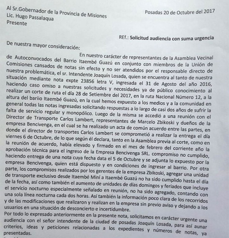Los vecinos autoconvocados de Itaembé Guazú se cansaron de no obtener respuestas por parte de la empresa de transporte monopólica y decidieron elevar el reclamo al gobernador Hugo Passalacqua. “Pretendemos que intervenga en este gran problema que tenemos, porque ni la empresa ni el Municipio se hizo cargo de lo firmado”, indicaron los vecinos mediante una carta enviada al mandatario, a quien solicitaron una audiencia con “suma urgencia”. La nota de los vecinos fue presentada y recibida ayer, en la que detallaron todo el reclamo. Ingresó a la Municipalidad y también elevaron el escrito al Gobernador de la provincia para que interceda ante sus demandas. Los autoconvocados precisaron los números de expedientes y fecha de entrega de todas las notas presentadas ante los organismos responsables de sistema de transporte en Posadas. Según los vecinos, el monopolio sigue incumpliendo con el acta firmada hace dos semanas y cuyos puntos debían estar activos a partir del pasado lunes. En la misiva dirigida a las autoridades, enumeraron que “los compromisos asumidos por los gerentes del Grupo Z de agregar una unidad de transporte exclusivo desde Itaembé Miní a Itaembé Guazú no ha sido cumplido hasta el día de la fecha. Así como también el aumento de unidades de días domingo y feriados que incluye el horario nocturno no ha sido agregado, contando con una sola línea nocturna cada dos horas”. Asimismo precisaron que “sigue siendo poco clara la información de los recorridos y las modificaciones que se realizaron desde la empresa de transporte sin previo aviso, dejando a los usuarios en una situación de desconcierto e incertidumbre”. En esta nota, los vecinos autoconvocados también exigieron reunirse con el Ejecutivo posadeño.En el escrito, además, detallaron las siete notas anteriores presentadas sin respuesta favorable a sus demandas, y que fueron apuntadas a los empresarios del Grupo Z, de Bencivenga y al funcionario municipal Carlos Lambert. Guayan comentó que la decisión fue tomada en una asamblea llevada a cabo el pasado miércoles en el barrio, donde los vecinos evaluaron el poco compromiso del monopolio a cumplir con lo firmado. Si bien “reconocemos que cumplieron algunas cosas, siempre termina en lo mismo. Hacen algo bien para silenciar a los usuarios y después incumplen todo”, dijeron los vecinos. Y recordaron que Lambert se comprometió ante ellos, en la última reunión, a elevar lo firmado en febrero último respecto a la aprobación técnica para que la empresa Bencivenga pueda ingresar al barrio, pero “Itaembé Guazú todavía sigue dependiendo del monopolio”.