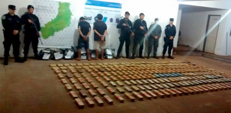 El procedimiento se realizó en el marco de una investigación a un grupo de "mulas" dedicadas al acondicionamiento y traslado de marihuana. Las pesquisas llevaron a efectivos de la UR-V, durante la noche del viernes, a montar vigilancia en  las 2.000 hectáreas por donde iban a transitar con una carga de estupefaciente.A unos 50 metros de la Escuela Epet Nº 51 y Escuela Provincial Nº 862 los policías sorprendieron y detuvieron  a dos "narcos"  identificados como Héctor C. (26) y  Jorge C. (26) ambos indocumentados, oriundos de Ciudad del Este (Paraguay). Junto al dúo había cinco cajas grandes cubiertas de nylon.Los investigadores iniciaban la custodia para el conteo y peso de rigor cuando diez minutos después, aparecieron otros dos narcos, a bordo de una moto de alta cilindrada y abrieron fuego contra el personal policial, presuntamente intentando recuperar la carga y liberar a los detenidos. En ese momento se produjo un intercambio de disparos con los integrantes de la fuerza provincial. Uno de los proyectiles  impactó a la altura del pecho de un comisario mayor que fue hospitalizado y salvó su vida gracias al chaleco antibalas: si bien el proyectil perforó el chaleco, fue absorbido por la malla Kevlar. Los "motonarcos" vieron frustradas sus intenciones y huyeron. A esta hora prosigue un intenso operativo en la zona para la captura de ambos. Una vez en la Unidad Regional, con la intervención del Juzgado Federal de Eldorado, efectivos policiales contabilizaron 232 panes de marihuana, los que pesaron en total los 182,570 kilogramos. El aforo es de casi 3.500.000 pesos.Los detenidos y elementos secuestrado fueron puesto a disposición  del Juzgado Federal Eldorado.