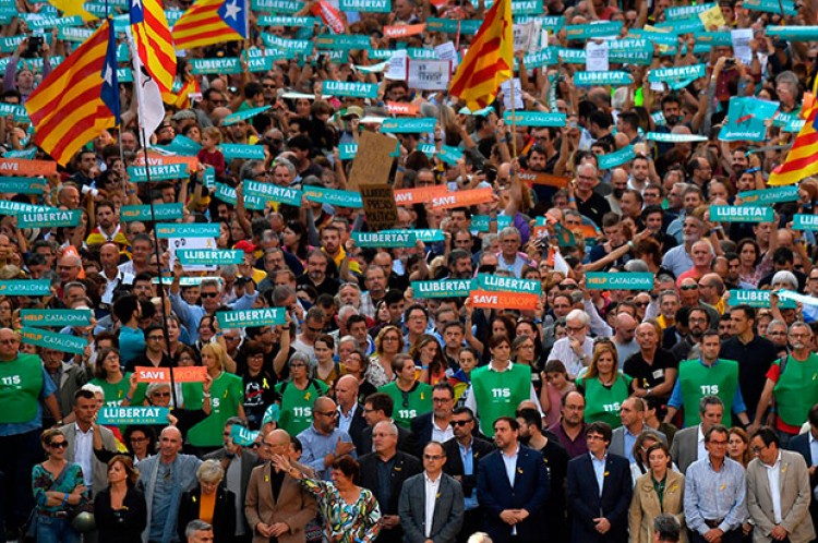 "Es hora de declarar la independencia", dijo a la AFP Jordi Baltá, de 28 años, empleado de una papelería, estimando que ya no hay espacio para el diálogo.La manifestación se había convocado originalmente para reclamar la liberación de dos líderes de organizaciones indepedentistas, Jordi Cuixart, de Omnium Cultural, y Jordi Sánchez, de la Asamblea Nacional Catalana, encarcelados como sospechosos de sedición.Sin embargo, el anuncio del gobierno de Rajoy de que pedirá al Senado -la cámara competente- el cese de todo el gobierno independentista y la convocatoria de elecciones regionales en seis meses, realzaron el perfil de la protesta.La llegada de Puigdemont al frente del cortejo fue saludada con gritos de "¡presidente, presidente!". Junto a él, se colocaron el resto de miembros del ejecutivo catalán, amenazados si, en una semana, y como parece, el Senado -donde el PP de Rajoy tiene mayoría absoluta- aprueba las medidas de Rajoy."Nos sentimos catalanes y el sentimiento de español ya no existe, el pueblo catalán está desconectado completamente de las instituciones españolas, sobre todo de lo que es el Estado español", dijo Ramón Millol, un mecánico de 45 años."Me siento totalmente indignada y sumamente triste, porque siento que nos pisan nuestros derechos y también nuestras ideas como catalanes", explicó Meritxell Agut, una empleada de banca de 22 años."Pueden destruir el gobierno, pueden destruir todo lo que quieran pero nosotros vamos a seguir luchando", aseguró desafiante Agut."¡Que se vayan!"La sociedad catalana está dividida en partes aproximadamente iguales entre quienes quieren la independencia o no, pero la intervención del gobierno español en la administración catalana podría disgustar a parte de los segundos, como escribió en Twitter la alcaldesa de la ciudad, Ada Coalu: "Rajoy ha suspendido el autogobierno de Cataluña por el que tanta gente luchó. Un grave ataque a los derechos y libertades de todos, aquí y en todas partes".La manifestación se extendía más allá de las cuatro calles de la céntrica y ancha avenida del Paseo de Gracia que se habían previsto inicialmente, en un sábado soleado. Como es habitual, la bandera dominante fue la independentista catalana, la "estelada" (estrellada), por la estrella blanca sobre fondo azúl que la preside.Los manifestantes abucheaban, lanzaban insultos y alzaban el dedo corazón cada vez que un helicoptero de la policía española sobrevolaba la protesta con un ruido ensordecedor."¡Que se vayan!", dijo irritado Baltá, mirando al cielo.Rajoy se amparó en el artículo 155 de la Constitución para solicitar a la cámara alta del legislativo tomar el control de la administración catalana.Además, el jefe del gobierno pidió la potestad de disolver el Parlamento catalán, actualmente en manos de Puigdemont, para "convocar elecciones en un plazo máximo de seis meses"."El pueblo es el que tiene el derecho y la ley" El presidente catalán no respondió todavía pero lo hará en un mensaje institucional esta noche a las 21H00 (19H00 GMT). Esta semana había amenazado con una proclamación unilateral de independencia si se aplicaba el artículo 155, basándose en el referéndum inconstitucional del 1 de octubre, en el que ganó la independencia."La aplicación del 155 es excesiva", lamentó José Rodríguez, un funcionario de comunicaciones de 41 años.Puigdemont podrá presentar alegaciones en el Senado para evitar las medidas.Los manifestantes expresaban su descontento con los periodistas de medios nacionales, al grito de "¡prensa española, manipuladora!".Joan Cañalas Ríos, un obrero metalúrgico de 56 años, dijo que "el pueblo es el que tiene el derecho y la ley"."Queremos mas democracia, más diálogo, manifestarse es nuestra forma de protestar", antes de recordar a "los Jordis", como se les llama a Cuixart y Sánchez, a los que describió como "presos políticos".Fuente: Agencia de Noticias AFP/NA