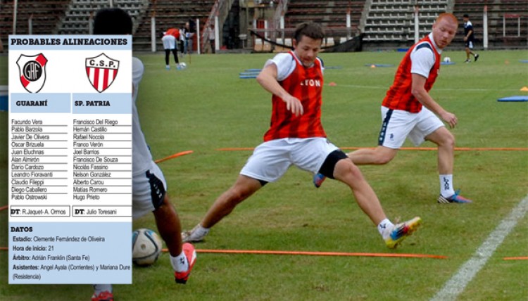 Con la necesidad imperiosa de sumar de a tres, Guaraní Antonio Franco afrontará esta noche otro duro compromiso frente a Sportivo Patria de Formosa, en un partido válido por la octava fecha del torneo Federal A, zona 4.El partido se disputará en el estadio franjeado de Villa Sarita, desde las 21, con arbitraje del santafesino Adrián Franklin.En el encuentro de esta noche, al equipo lo dirigirá una dupla interina compuesta por Ramón “Toti” Jaquet y Alejandro Ormos, pues mañana asumirá como entrenador Miguel Ángel Salinas como reemplazante de Sebastián Pena.Los magros números del equipo posadeño, que perdió seis de siete partidos lo pone en la última colocación de la llave 4, lejos del lote de vanguardia, por lo que todos entienden que, más allá de las formas (el juego), lo realmente importante de ahora en más es el resultado. Este pareciera ser el momento más importante para establecer un quiebre en el funcionamiento, especialmente en el aspecto anímico.Hay varias novedades en la conformación misionera para el juego frente al “Decano” formoseño, como por ejemplo los retornos de Leandro “Colo” Fioravanti, Alan Almirón y Facundo Vera. El choque de esta noche es un partido complicado, pues todos los partidos que jugó la Franja hasta el momento en Villa Sarita le han sido adversos.Guaraní hizo fútbolLa dupla Jaquet-Ormos probó el equipo con algunos cambios en la formación. La novedad estuvo dada en la presencia en el probable equipo titular de Facundo Vera en lugar de Ezequiel Navarro Montoya. En la línea de fondo lo hicieron Barzola (luego fue reemplazado por Cañete por una sobrecarga muscular), De Olivera (por Pereira), Brizuela y Kopp; Almirón (por Eluchans), Fioravanti (por Cañete), Cardozo y Fileppi; Caballero y Ostrowski.Tampoco estuvo en el equipo “titular” que probó la Franja el capitán Juan Eluchans, quien había terminado con una contractura muscular frente a For Ever. Con variantesEl entrenador visitante tendrá una variante obligada, pues no podrá contar con el delantero goleador y capitán Hugo Troche, quien fue expulsado frente a Crucero del Norte y no será de la partida esta noche. Si bien Julio Toresani, el DT de Patria, no dio a conocer el equipo, es muy factible que ingresen como titulares Matías Romero y Hugo Prieto por el suspendido Troche y Campozano.
