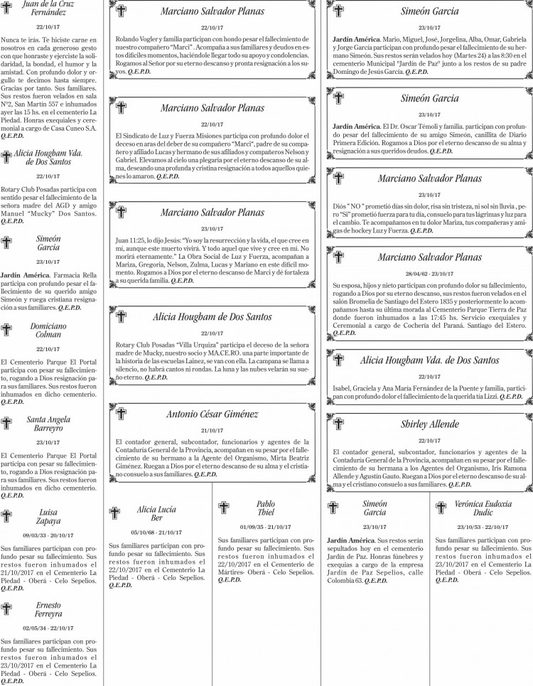 Fúnebres del martes 24 de octubre de 2017