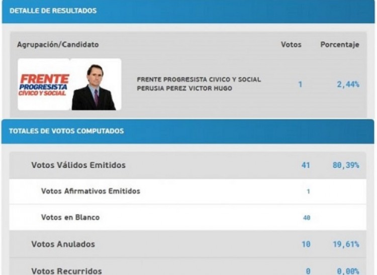 En la localidad santafesina de Colonia Raquel, en el departamento Castellanos, viven 530 personas según el censo de 2010. Este pueblo casi desconocido "saltó a la fama" nacional en las últimas horas después de que en las elecciones del último domingo se registrara allí uno de los resultados más insólitos de la historia reciente de la democracia argentina: el presidente comunal (una especie de intendente en localidades pequeñas de Santa Fe), Víctor Hugo Perusia Pérez, fue reelecto con un solo voto a favor.Es muy probable que se haya votado a sí mismo, piensan en Colonia Raquel, donde el domingo apenas se registraron 41 sufragios válidos y 40 de ellos fueron en blanco.En el padrón estaban habilitados para votar 265 personas, pero solo el 19,25% concurrió a las urnas. De los 51 ciudadanos que emitieron su voto, 10 lo anularon, 40 fueron en blanco y el único voto afirmativo fue para Perusia Pérez, quien gracias a esa exigua cosecha seguirá al frente del municipio.Fuente: Diario Uno