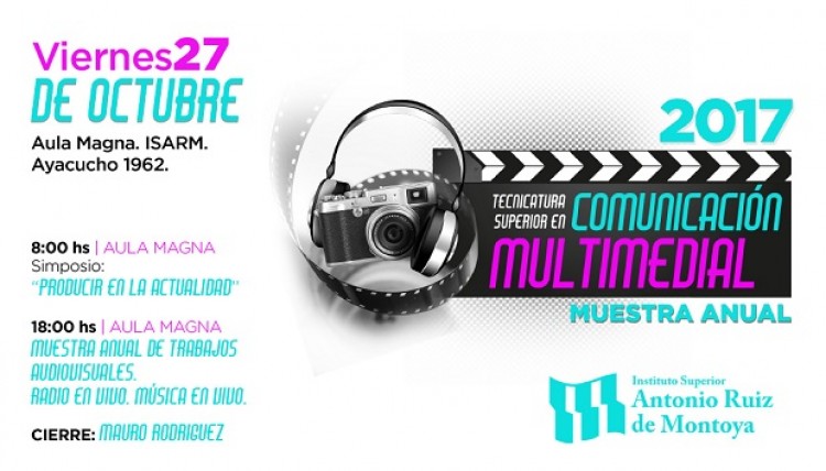 La Tecnicatura Superior en Comunicación Multimedial del Instituto Superior Antonio Ruiz de Montoya invita a la comunidad en general a participar del Simposio y la Muestra Anual de trabajos de la carrera, que tendrá lugar el viernes 27 de octubre en el Aula Magna de la Sede Central, ubicada en la calle Ayacucho 1.962 de Posadas. El simposio “Producir en la actualidad” abarca las siguientes actividades:8.00 “La estética como construcción” a cargo de Froilán Fernández, Magíster en Semiótica.9.30 “La producción en la actualidad y las productoras independientes como apuesta creativa y laboral” a cargo de Ariel Saidel, Productor, Fotógrafo y Realizador Audiovisual.11.00 “La posproducción y los desafíos del photoshop y el after effect” a cargo de Guillermo Zdanovicz, Productor y Director para Radio y Televisión, Realizador audiovisual.12.30 Cierre.Luego, a partir de las 18:00 comenzará la muestra en el Aula Magna con proyección de trabajos audiovisuales, noticieros, video clips, video artes, ficciones, artísticas radiales realizadas por los alumnos en los espacios curriculares correspondientes al período 2017. Desde las 19:30, en el patio del Instituto, se harán: Radio en vivo, actividades interactivas, exposiciones gráficas y un cierre musical con Mauro Rodríguez.
