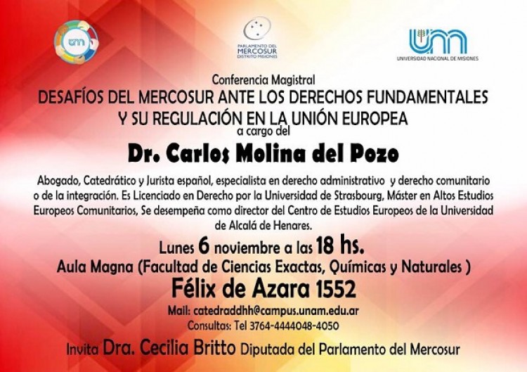 "Los desafíos del Mercosur ante los Derechos Fundamentales y su regulación en la Unión Europea" serán la temática de una conferencia magistral de Carlos Molina del Pozo, abogado, catedrático y jurista español, especialista en Derecho Administrativo y Derecho Comunitario o de la Integración.Es Licenciado en Derecho por la Universidad de Strasbourg, Máster en Altos Estudios Europeos Comunitarios por el Colegio de Europa, Master en Dirección de Empresas por el Instituto de Empresa, y Doctor en Derecho por la Universidad de Granada.Se desempeña como director del Centro de Estudios Europeos de la Universidad de Alcalá de Henares, presidente de la Asociación Universitaria de Estudios Comunitarios, director del Centro de Documentación Europea de la Universidad de Alcalá de Henares (Madrid), y presidente del Instituto Eurolatinoamericano de Estudios para la Integración.Es uno de los principales expositores del Encuentro de Especialistas del MERCOSUR de la Facultad de Derecho de la Universidad Nacional de Rosario.Ha sido distinguido como Catedrático "Jean Monnet" de Derecho Comunitario Europeo, y como Doctor Honoris Causa por la Universidad Nacional de Córdoba de Argentina.Durante el encuentro también se procederá a la firma de un convenio entre el Parlamento del Mercosur Misiones y la Universidad Nacional de Misiones para avanzar en estudios superiores sobre cooperación e integración internacional.  Consultas e inscripciones al (376) 4444058-4050 o [email protected]