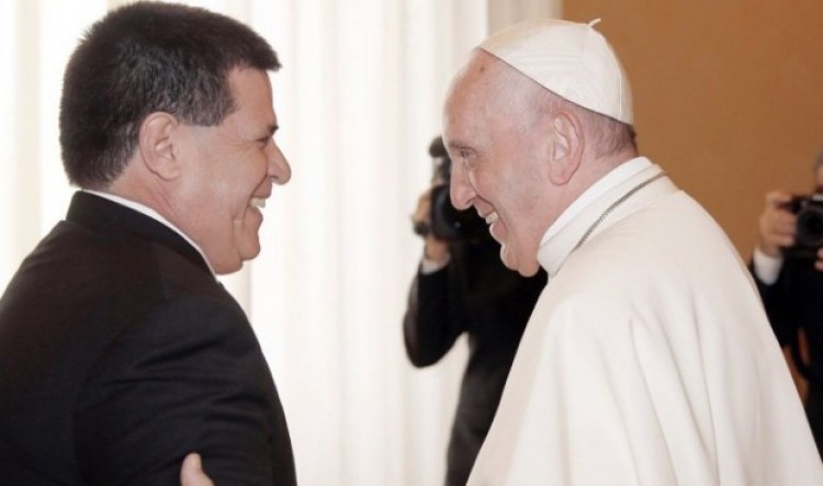 El pontífice recibió a Cartes en una reunión de 42 minutos en la biblioteca del palacio apostólico del Vaticano, en lo que el propio mandatario definió al saludarlo como "la última visita" antes de que se termine su mandato en abril próximo.“¿Estarás cansado de este paraguayito?”, le preguntó entre risas Cartes al iniciar la reunión, durante el tradicional saludo de bienvenida en la sala del Tronetto, antesala del lugar en el que mantuvieron el encuentro a solas.Tras la reunión y luego de que el mandatario presentara a la delegación de 14 personas, Cartes le mostró al Papa los avances en el barrio “San Francisco”, que construye en una zona del norte de Asunción para 1.000 familias carenciadas y que empezará a ser habitable en un mes.“Los paraguayos tienen ese sano orgullo. Esto es muy bello, es tener amor y respeto al pueblo. Lo felicito”, le dijo Jorge Bergoglio tras ver primero un libro con fotografías de las obras y luego un video directamente sobre un Ipad que le regaló Cartes.El mandatario le obsequió además un cesto con chipá y un cuadro de la Virgen de Caacupé.Francisco, en tanto, le obsequió un medallón que simboliza “el ángel de la paz y de la vida”.“Es por un mundo de solidaridad y de paz fundado sobre la Justicia. Es lo que están haciendo ustedes, ¿no?”, lo despidió el papa antes de entregarle tres de sus documentos publicados hasta ahora, las exhortaciones Evangelii gaudium y Amoris laetitia y la encíclica Laudato si’.La reunión se dio en un contexto en el que, según la última medición de la consultora Latinobarómetro, Paraguay es el país de América Latina en el que el pontífice tiene mejor imagen, con un 8.3 de valoración positiva promedio en una escala del 1 al 10, mientras la media regional se ubica en 6.8 y Argentina en 6.6Por la mañana, antes de visitar al papa, Cartes y su comitiva plantaron en los jardines vaticanos dos ejemplares de lapacho, el árbol nacional de Paraguay, uno con flores y otro con flores amarillas, en homenaje a la bandera pontificia.También descubrieron una imagen de la Virgen de Caacupé, la patrona del país y por cuyo santuario pasan anualmente unas 4 millones de personas de las 7.5 millones que habitan Paraguay. Fuente: Télam