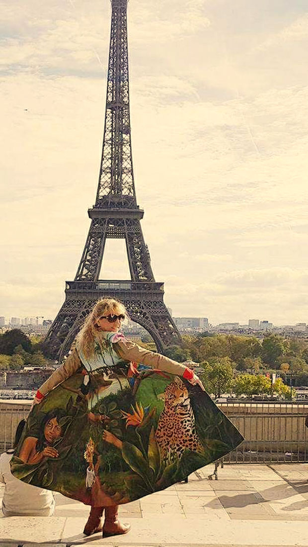 Representando a Argentina obtuve medalla de plata con mi obra Late mi Tierra, en una exposición realizada en el Carrousel Du Louvre en París, Francia. El evento fue organizado por Artcom Internacional Expo. Las obras fueron seleccionados bajo el criterio de la asociación Internacional de artistas, cuya Directora es la Baronesa Jiselda Salbu, y la invitación vino directamente desde un integrante de la misma, el artista brasileño Silvio Duarte.Cuando llegué a Francia sentí una emoción profunda, me sentía dentro de un sueño, o de una película. Miré al cielo y entendí que era el mismo para todos, me hizo comprender la inmensidad del mundo, que a pesar de estar tan lejos, la distancia no nos separa realmente, que miramos al mismo sol, juntos en todo el planeta.La obra que presenté es una imagen que representa a mi provincia a mi tierra. Pero aun así, me la quise llevar puesta. Así que días antes de viajar trabajé en la pintura de un tapado, con la intención de que tuviera todo lo que nos o me representa.Mi saco está pintado con motivos de Misiones. El yaguareté, loros y tucán. El rostro de los pueblos originarios y una ucraniana para representar el crisol de razas, y mis raíces. Orquídeas y mariposas, y como siempre la monarca en mi pecho. Y el cuello bordado con piedras de Misiones, ágatas verdes, ágatas cornalinas, amatistas, cristal ahumado y topacio citrino.Fue una gran sorpresa el recibir medalla de Plata por mi obra. Pero eso tan solo era el comienzo de un sinfín de emociones.