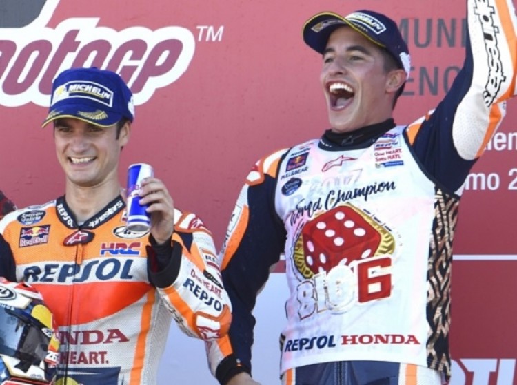 El español Marc Márquez (Honda) repitió este domingo conquista y se consagró tetracampeón de Moto GP, al arribar en la tercera posición en el Gran Premio de Motociclismo Mundial de la Comunidad Valenciana en el autódromo Ricardo Tormo, por la última fecha del calendario anual de la categoría. El piloto, de 24 años y oriundo de Cervera, aprovechó la rápida deserción de su máximo adversario, el italiano Andrea Dovizioso (Ducati), quien abandonó cuando transitaba la quinta vuelta. De este modo, Márquez, que también había ganado los campeonatos 2013, 2014 y 2016, logró el título mucho antes de que finalizara la carrera, finalmente ganada por el también español Dani Pedrosa (Honda), que acumuló un tiempo de 46m. 08s. 125/1000 para recorrer los 30 giros pautados. Segundo se ubicó el francés Jonathan Zarco (Yamaha), quien cerró su actuación a 337 milésimas, mientras que Márquez arribó tercero, a 10s. 861/1000Cuarto se clasificó el español Alex Rins (Suzuki), mientras que los italianos Valentino Rossi (Yamaha) y Andrea Iannone (Suzuki) se ubicaron quinto y sexto, respectivamente. Márquez, que también había logrado campeonatos en 125 centímetros cúbicos (2010) y Moto2 (2012), sumó un total de 298 unidades, en la clasificación, aventajando nítidamente a Dovizioso, que se quedó con 261. Más atrás se situaron Maverick Viñales (Yamaha), con 230 puntos; Pedrosa, 210; Rossi, 208; Zarco, 174. Fuente: Télam