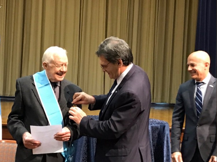 El Gobierno le entregó "la Orden del Libertador San Martín", la más alta distinción otorgada por nuestro país a funcionarios de gobiernos extranjeros, al expresidente de Estados Unidos Jimmy Carter, por "su papel en la defensa de los derechos humanos y su apoyo a los argentinos" durante la última dictadura militar.Fue a través de una ceremonia que encabezó el secretario de Derechos Humanos y Pluralismo Cultural de la Nación, Claudio Avruj, en el Carter Center de la ciudad de Atlanta, donde el funcionario argentino destacó el rol de Carter "durante el período más triste y cruento" de la historia del país."Cuando fui Presidente trabajé para establecer que los derechos humanos sean una pilar fundamental de mi administración.Todos mis embajadores en el mundo fueron instruidos por mí personalmente para que sean embajadores de los derechos humanos", destacó Carter. El exfuncionario estadounidenses se mostró además "complacido con el rumbo que han tomado los derechos humanos en la Argentina" y, al respecto, dijo que estaba "muy feliz por ver desde la distancia que han erradicado la tortura en las prisiones y han promocionado los derechos de los pueblos indígenas y el respecto por los derechos humanos".Por su parte, el secretario Avruj destacó la tarea del expresidente de Estados Unidos y sostuvo que Carter "está muy incorporado en el sentimiento de los argentinos por la acción que llevó en los años más oscuros del país, cuando la dictadura estaba en su momento más feroz"."Él levantó la bandera para el mundo de los derechos humanos y fundamentalmente él, cara a cara, habló con los dictadores pidiendo por justicia, pidiendo por derechos humanos y denunciando el terrorismo de Estado y la desaparición forzada de personas", insistió.Fuente: NA