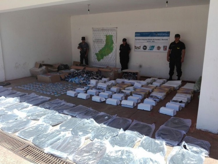 Pasado el mediodía de este lunes, en las afueras de Puerto Iguazú y en cercanías al río Paraná, la división Toxicomanía estaba en plena recorrida cuando halló en un malezal 17 bultos embalados con plástico de color negro. Por cuestiones de seguridad y en presencia de testigos, se trasladó el cargamento hasta la dependencia policial para su apertura y, una vez realizado esto, se constató que había 80 termos grandes; 95 termos chicos; 46 frascos con suplemento vitamínicos; 80 carteras; 80 perfumes; cremas de mujer; 150 pomos de adhesivos; 150 protectores de celulares; mil lentes para sol; dos máquinas electrónicas; 200 corpiños adhesivos y 200 gruesas de cigarrillos de diez atados cada. El valor total de lo incautado asciende a unos 185 mil pesos. Previamente, a media mañana, otro operativo policial de la Unidad Regional V sobre la avenida Matías Aracú permitió el decomiso de 20 bultos con 2.200 autitos, 2.000 lentes de sol y 80 mochilas sin aval aduanero, todo lo cual fue valuado en 86 mil pesos.