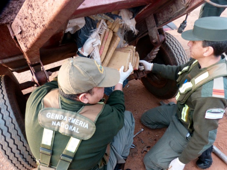 Personal de Gendarmería Nacional desarticuló una banda acusada de trasladar droga desde Misiones hacia la provincia de Buenos Aires. Por el hecho hay ocho sospechosos detenidos, varios de ellos domiciliados en Jardín América, en tanto que durante el mega operativo, concretado en esa misma zona, los efectivos incautaron poco más de 600 kilogramos de marihuana que fueron hallados ocultos dentro de un camión cisterna, según informaron desde la citada fuerza federal.Voceros del caso señalaron que la investigación tras esa organización delictiva comenzó hace seis meses. El pasado lunes los pesquisas que conforman la Unidad de Operaciones Especiales Antidrogas de Gendarmería, decidieron dejar de pisarle los talones y sorprendieron a parte de la gavilla en pleno traslado de estupefacientes. En forma paralela y orden judicial mediante los uniformados realizaron al menos cinco allanamientos, donde procedieron a arrestar a cinco hombres y dos mujeres (todos mayores de edad y de nacionalidad argentina), bajo sospecha de estar vinculados a esta actividad narcocriminal. Operativo cerrojo De esta manera, el pasado lunes y con ordenes emanadas del Juzgado Federal 1 de Corrientes, efectivos de la Unidad Operaciones Especial Antidrogas y personal del Escuadrón 11 “San Ignacio” -de Misiones-, montaron un operativo cerrojo por distintos caminos cercanos al municipio de esa jurisdicción. El objetivo de los federales era un automóvil Peugeot 504 y una camioneta Ford Ranger. Según los datos de inteligencia que manejaban los gendarmes, los ocupantes del primer rodado hacían las veces de “campana” o de “guía”, es decir que iba adelante en la carretera para alertar sobre posibles controles camineros al primero, que de acuerdo a las fuentes, trasladaba la carga ilícita. Para poder cercar a estos individuos y los rodados en los cuales se movilizaban, los investigadores implementaron un control sorpresivo en las proximidades del “arroyo Yabebiry”, sobre la ruta nacional 12. En dicho lugar detuvieron la marcha del automóvil, ocupado por dos hombres y una mujer, que era secundado a pocos metros por la camioneta que llevaba un tanque cisterna acoplado, siempre de acuerdo al reporte de los efectivos. Si bien el parte informativo de Gendarmería no lo menciona, se presume que el hombre que iba al volante de éste último vehículo habría sido demorado. Acto seguido y tras interceptar a los sospechosos, el magistrado del citado Juzgado correntino interviniente solicitó una extensión de jurisdicción al juez federal de Eldorado para inspeccionar la camioneta y el tanque cisterna ante testigos. Fue entonces que entraron en escena los canes detectores de narcóticos “Larry” y “Pehuén”. Al cabo de unos minutos ambos animales olfatearon algo extraño. Los gendarmes revisaron el camión cisterna y descubrieron que, en forma oculta, se hallaba una compuerta preparada para cargar droga en la parte baja del tanque. Al requisar en forma más minuciosa, encontraron acondicionadas un total de once bolsas de arpillera conteniendo 832 paquetes de marihuana, que arrojaron un peso total de 622, 605 kilogramos, precisó el parte oficial.Allanamientos Mientras se desarrollaba la incautación del cargamento de la “hierba maldita”en cercanía al cauce del Yabebiry, en forma paralela entró en acción el equipo de Fuerzas Especiales de Procedimientos Judiciales de Gendarmería Nacional, que efectuó un allanamiento en cinco inmuebles ubicados en Jardín América, donde detuvieron a cuatro personas más, secuestrando otras dos camionetas, dos motocicletas, teléfonos celulares, dinero en efectivo y documentación de interés para la causa.