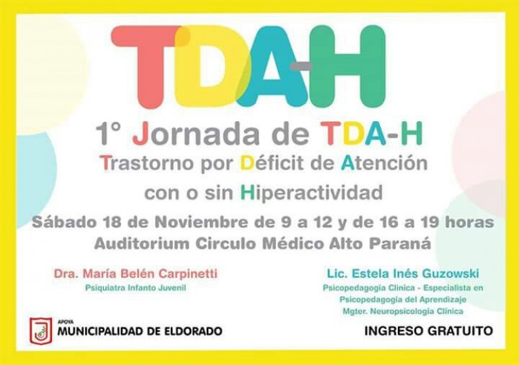Este sábado 18, de 9 a 12, en el auditorio del Círculo Médico Alto Paraná, tendrá lugar la primer Jornada de trastorno por Déficit de Atención con o sin Hiperactividad. La actividad es organizada por la Municipalidad de Eldorado y el ingreso gratuito. Disertarán la médica psiquiátrica infanto juvenil María Belén Carpinetti y la licenciada en psicopedagogía clínica, especialista en psicopedagogía del aprendizaje y magister en neuropsicología clínica, Estela Inés Guzowski.