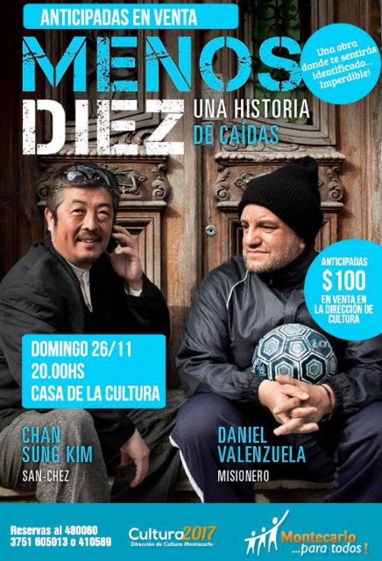 Esta es la historia de "El Misionero", quien fuera en su época unos de los mejores jugadores de fútbol del mundo, hoy se encuentra lejos de esos días de gloria y triunfos. Olvidado por todos, pasa sus días realizando jueguitos con la pelota en una calle peatonal céntrica, pasando la gorra como única entrada de dinero. De esa manera sobreviven junto a quien fuera su representante en los tiempos de éxito del Coreano San-chez, el único que sigue con el misionero ya que su situación siempre dependió de lo que hiciera su representado. Se aguantan, se soportan, se quieren, se odian, se mienten, se creen… En definitiva, por sobre todas las cosas, se necesitan el uno al otro para vencer el olvido. En una pieza prestada, en los fondos de un PH, estos amigos resisten y sobreviven tratando de encontrar los motivos de la situación actual. Misionero y San-chez son personajes que todos conocemos o vimos alguna vez. ¿Quién en algún momento no ha dicho "si yo hubiese hecho tal cosa en tal momento estoy seguro de que no me hubiese pasado todo lo que me está pasando"? Muy nuestro, muy argento esto de llorar lo perdido como así también vivir de los recuerdos pero no tener memoria. “Menos 10" es una obra donde queda eso de que la fama es puro cuento tratamos de hablar de todos nosotros. Simplemente una forma de mirarnos al espejo. Chang Sung Kim: Ha trabajado como actor en teatro en las obras “Romeo y Julieta” de W. Shakespeare, “Pequeño detalle” de E. Pavlovsky y “Arlequino” de Goldoni. En cine trabajó en: “El fondo de mar” (Damian Szifron), “Séptimo Arcangel” (J. B. Stagnaro), “Los esclavos felices” (Gabriel Arbos), entre otras. Televisión: “Gerente de familia”, “Buenos vecinos”, “Los Simuladores”, “Mosca y Smith”, “Graduados” y actualmente en “Vecinos en Guerra”. Daniel Valenzuela: Trabajos en cine: “Mundo Grúa” (P. Trapero), “Plata Quemada” (M. Piñeyro), “La Ciénaga” (L. Martel), “Un oso rojo” (A. Caetano), “Tiempo de Valientes” (D. Szifrón), entre otras. En televisión se destaca en “Los Simuladores”, “Tumberos”, “Mujeres asesinas”, y muchos más. Incursiona como autor y director teatral en las obras “Menos Diez” y “La familia Nuñez”. Su interés por la música lo lleva a grabar el material “Cabeza Dura” donde predominan la murga, el candombe, el barrio y el fútbol.