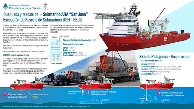 En ese mismo sector del área de búsqueda y recorriendo el posible itinerario del San Juan hacia Mar del Plata, tres destructores de la Armada Argentina barren el Atlántico Sur con equipos de sonar activo y pasivo, informó el jefe de Prensa de la Armada, capitán de navío Enrique Balbi, a periodistas tras la reunión que el presidente Mauricio Macri y el ministro de Defensa, Oscar Aguad, mantuvieron con los jefes de las tres fuerzas armadas en el Edificio Libertad para informarse sobre los avances del operativo.“Los jefes del Estado Mayor Conjunto y de las tres fuerzas armadas realizaron una exposición ante el presidente Macri en la que detallaron todos los medios desplegados en la búsqueda del submarino y que totalizan la participación de más de cuatro mil personas de siete países”, dijo Balbi.El portavoz señaló que “sobre el área desde dónde se emitió la última comunicación del submarino se está haciendo un trabajo con la corbeta Espora desplegada en el lugar y fotografías satelitales provistas por la Comisión Nacional de Actividades Espaciales que son analizadas por expertos del Ejército Argentino”.Agregó que “en la búsqueda se están utilizando todos los recursos que se pusieron a disposición desde nuestro país y desde otros países", e indicó que la fase de búsqueda y rescate "se va a sostener hasta el el submarino sea fehacientemente detectado y ubicado; esperamos que ahora que se redujo el viento y las olas en la zona las tareas de rastreo sean más efectivas”.“El presidente Macri prestó mucha atención a la exposición que detalló todos los trabajos que se realizan en Mar del Plata, la base Espora, Puerto Belgrano, Trelew y Comodoro Rivadavia, y nos pidió que extrememos la precisión en la información”, completó.La gran esperanzaEl buque de bandera noruega Skandi Patagonia, contratado por la Marina de Estados Unidos<a href="http://www.primeraedicion.com.ar/nota/260635/rescatistas-de-eeuu-se-dirigen-al-area-de-busqueda-del-ara-san-juan.html">, partió del puerto de Comodoro Rivadavia cargado con equipos de última generación tecnológica</a>, con destino a la zona de búsqueda del submarino ARA San Juan, desaparecido hace seis días.La nave especialmente acondicionada lleva, entre otros elementos, un sonar de búsqueda lateral, una campana de salvamento que puede operar hasta los 250 metros en profundidad y un vehículo de operación remota desde la superficie para poder inspeccionar el fondo, que puede trabajar hasta los 1200 metros.Antes de partir, el coordinador y capitán de navío de la Armada Argentina, Gabriel Actis, explicó en rueda de prensa en Comodoro que calculan "en un día y medio o dos poder estar en la zona de búsqueda" y remarcó que todo depende de las condiciones del mar.Actis, submarinista y experto en rescates, detalló que ahora la búsqueda se encuentra "en la fase de búsqueda y es una manera preventiva de estar alistados con un medio de rescate ya cerca en caso de tener algún tipo de rescate".La operación se realiza bajo el sistema ISMERLO (International Submarine Escape and Rescue Liaison Office – Oficina Internacional de Escape y Rescate de Submarinos) dado que la Armada Argentina pertenece al grupo, sostuvo el marino.El Skandi Patagonia, de 92 metros de eslora, que fue contratado por la Marina de los Estados Unidos para colaborar en la operación, se encaminará hacia una zona ubicada "al este del Golfo San Jorge, en el área norte, a unas 200 millas", dijo el capitán de navío. Fuente: Agencia de Noticias Télam