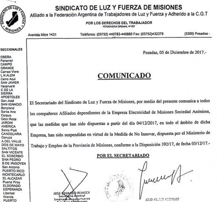 El Sindicato de Luz y Fuerza comunicó a sus afiliados que se suspenden todas las medidas y acatan la orden de “no innovar” emanada en las últimas horas del Ministerio de Trabajo de la Provincia, ya que en caso contrario corría el riesgo de que sea declarado ilegal.