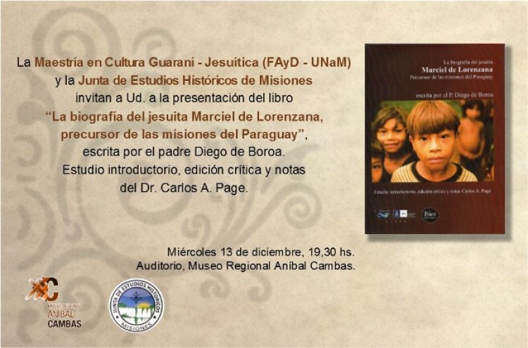 La Maestría en Cultura Guaraní-Jesuítica y la Junta de Estudios Históricos de Misiones presentan el libro “La Biografía del Jesuita Marciel de Lorenzana, precursor de las Misiones del Paraguay”. Será el miércoles 13 a las 19.30, en el auditorio del Museo Regional Aníbal Cambas. La Junta de Estudios Históricos de Misiones y la Maestría en Cultura Guaraní – Jesuítica de la Facultad de Arte y Diseño de la Universidad Nacional de Misiones, presentan el libro: “La Biografía del Jesuita Marciel de Lorenzana, precursor de las Misiones del Paraguay” escrita por el padre Diego de Boroa, con estudio introductorio, edición crítica y notas de Carlos A. Page.