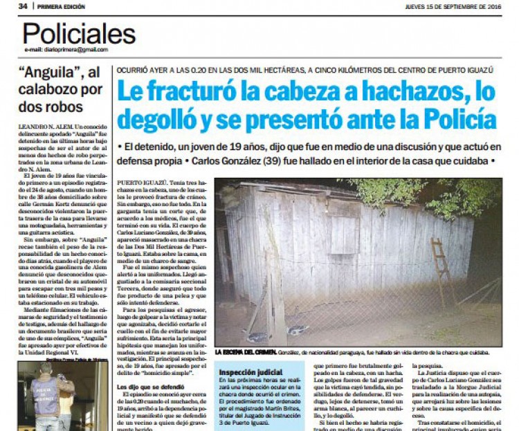 Está acusado de matar a Carlos Luciano González Urbieta (39) en septiembre de 2016 en Puerto Iguazú. Fue imputado de atacar a hachazos y luego cortarle el cuello a la víctima.