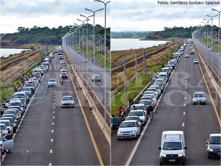 La fila para trasponer el puente San Roque González de Santa Cruz llegaba hasta Ñu Porá, acercándose ya a la curva del acceso sur. Miles de personas aguardan pacientemente para llegar a Paraguay, algunos a visitar a familiares otros a realizar compras en un intento por hacer que el dinero alcance.