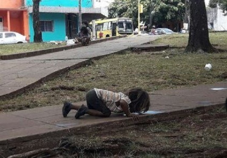 La foto fue sacada por la periodista Patricia Fernández y difundida por Miguel Ríos, un joven con marcado compromiso social. Mientras el país se prende fuego, esta niña guaraní se hidrata desde el suelo. Algo estamos haciendo mal como sociedad, ¿no?, posteó.