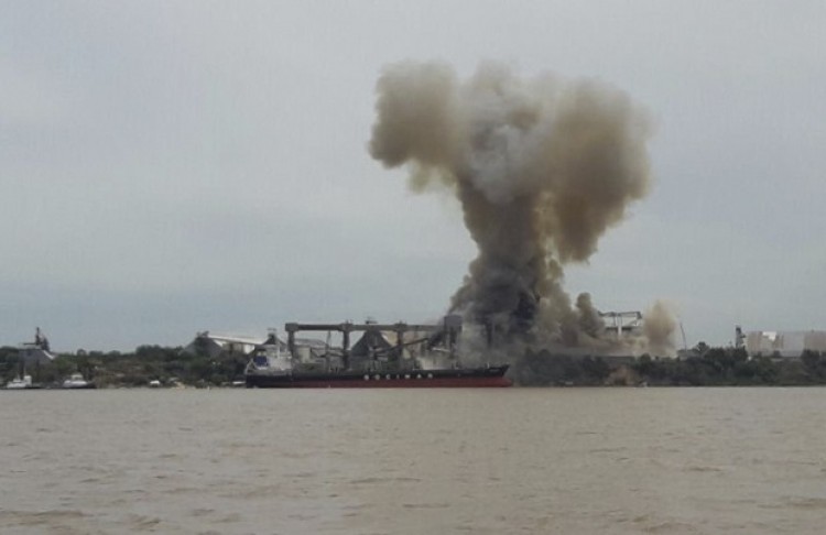 Una enorme columna de humo negro podía verse esta tarde desde la costa del río Paraná a la altura de Puerto General San Martín, donde está asentada la cerealera que fue propiedad de Nidera hasta su asociación con la estatal china.